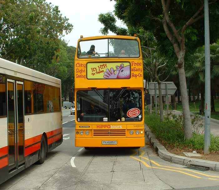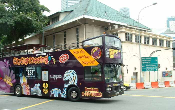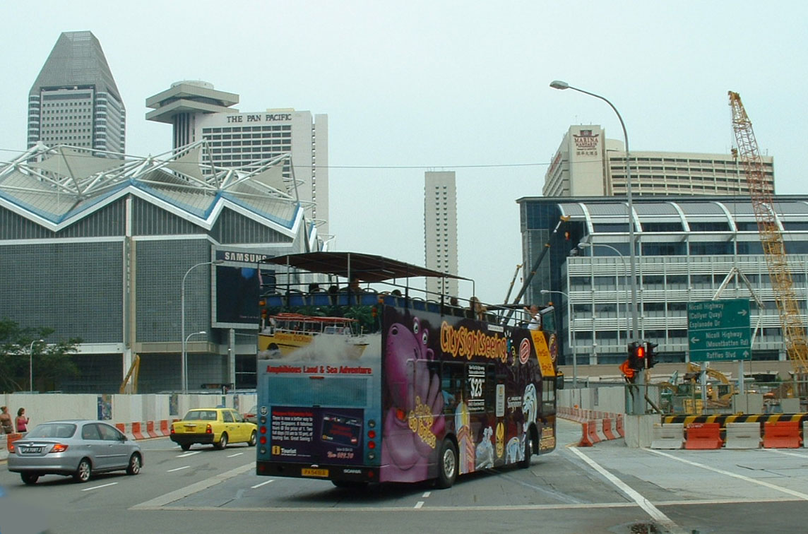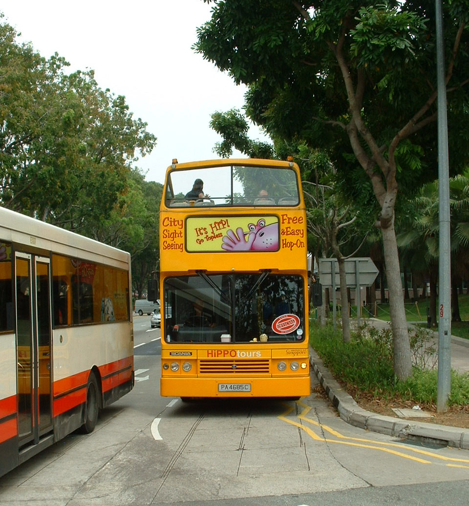 Unfortunately it was not possible to get a picture of the pink bus without something getting in the way, but this view shows the hippo motif well for the City Sightseeing franchise operator Hippo Tours. |