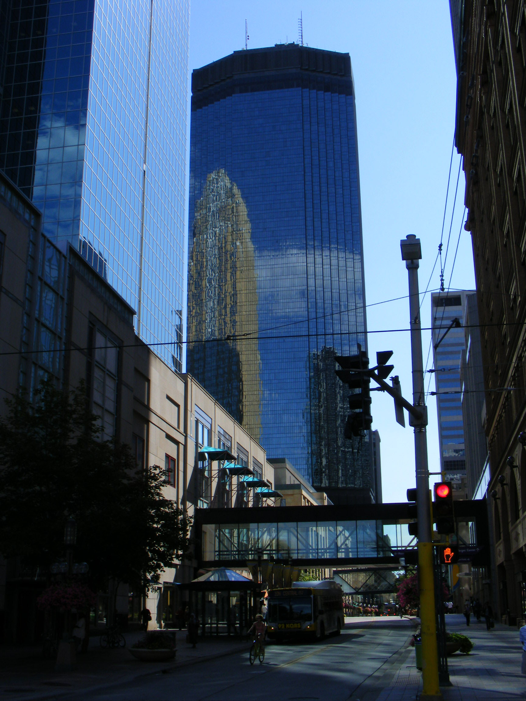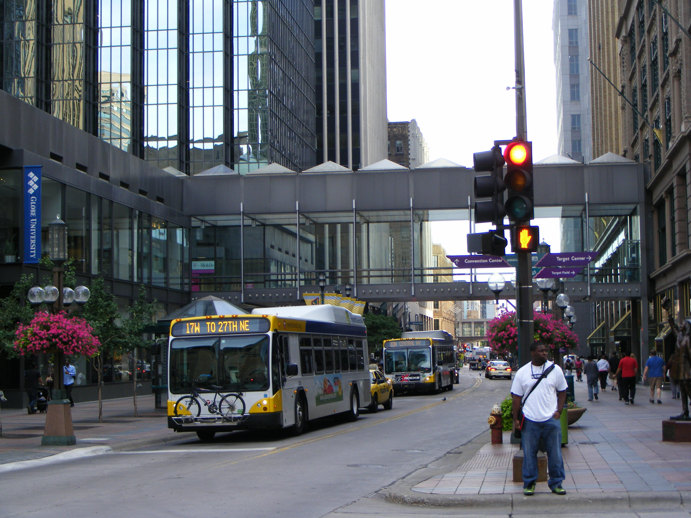 Some perspective on the Bus Mall with skyscrapers towering above this lone BRT Hybrid.