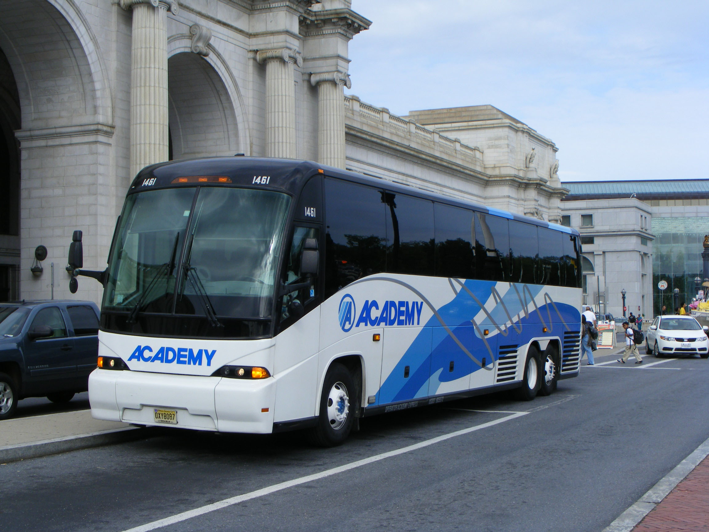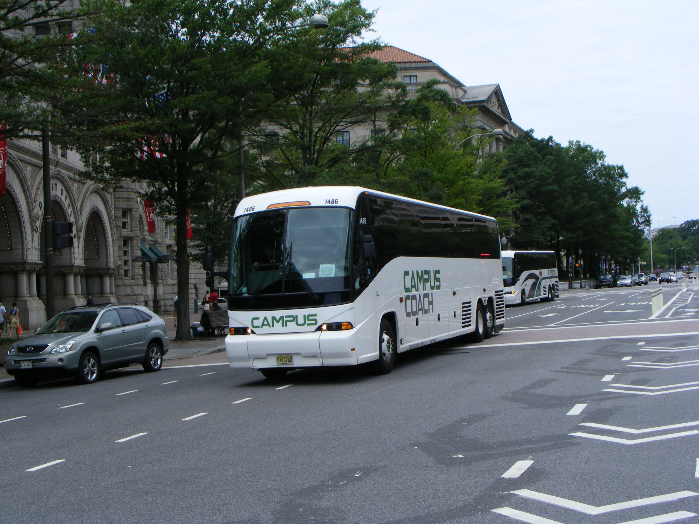 An Academy MCI is one of a stream of coaches heading into the city on the New Jersey Turnpike. |