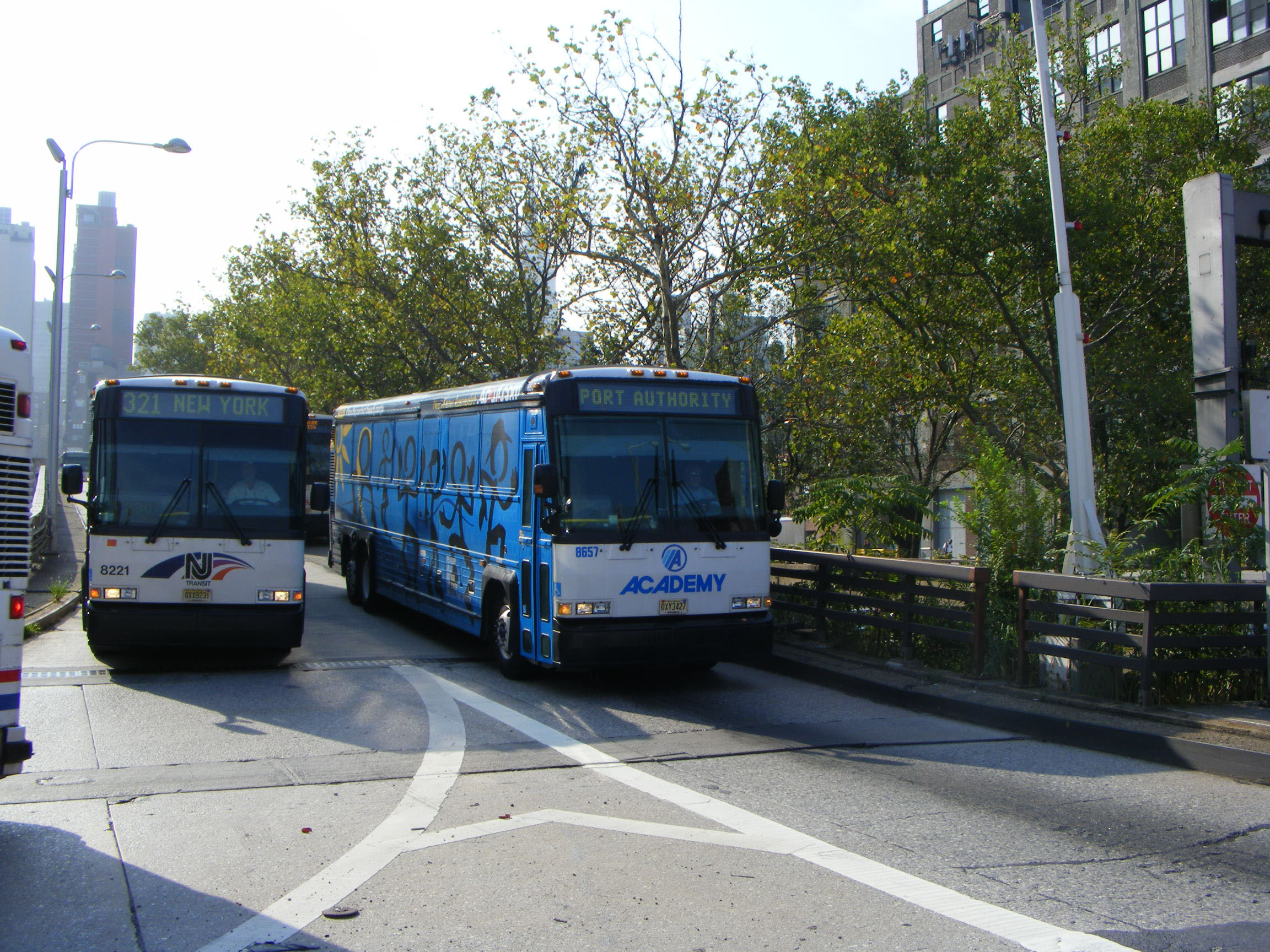 Arriving on Manhattan Island in August 2010 is a pair of MCI D4000-series coaches. On the left is NJ Transit 8221 and - looking like a victim of a graffiti attack - is Academy 8657. Unfortunately for the advertiser on the wrap on 8657, their message has been lost in the execution. |