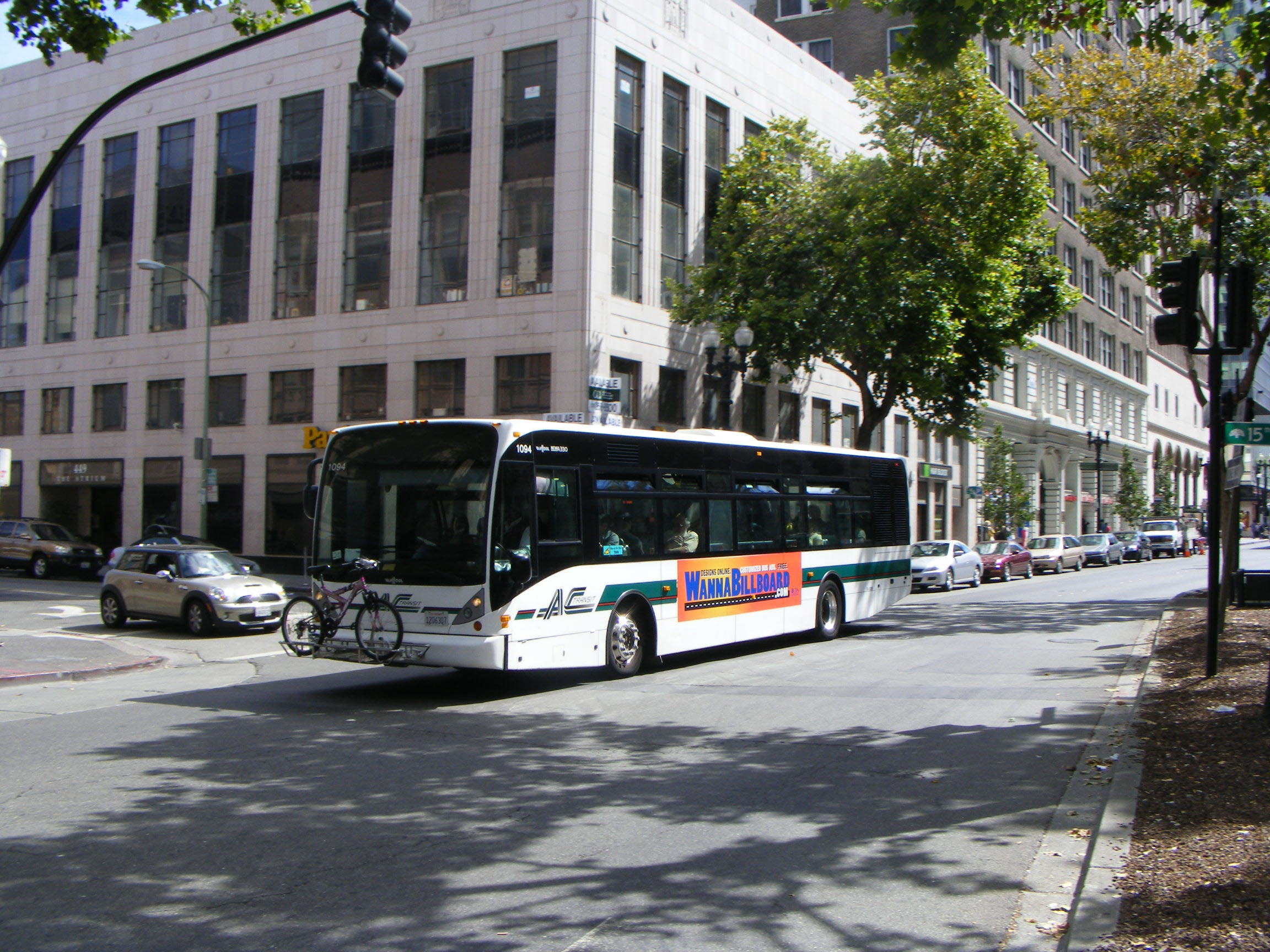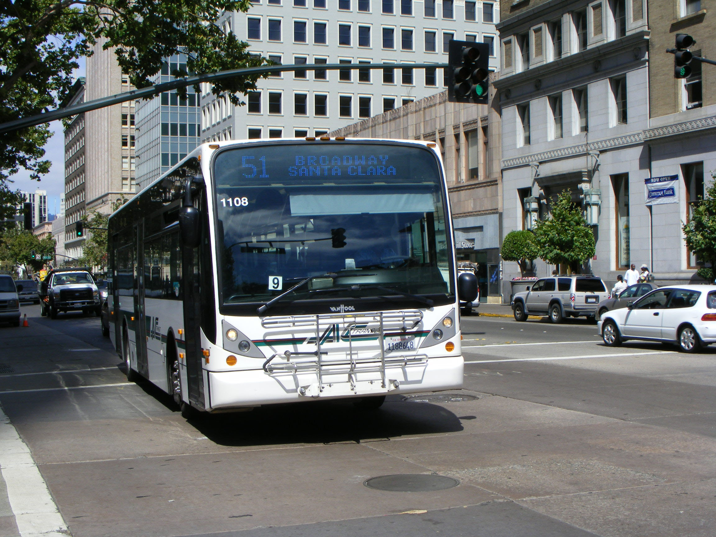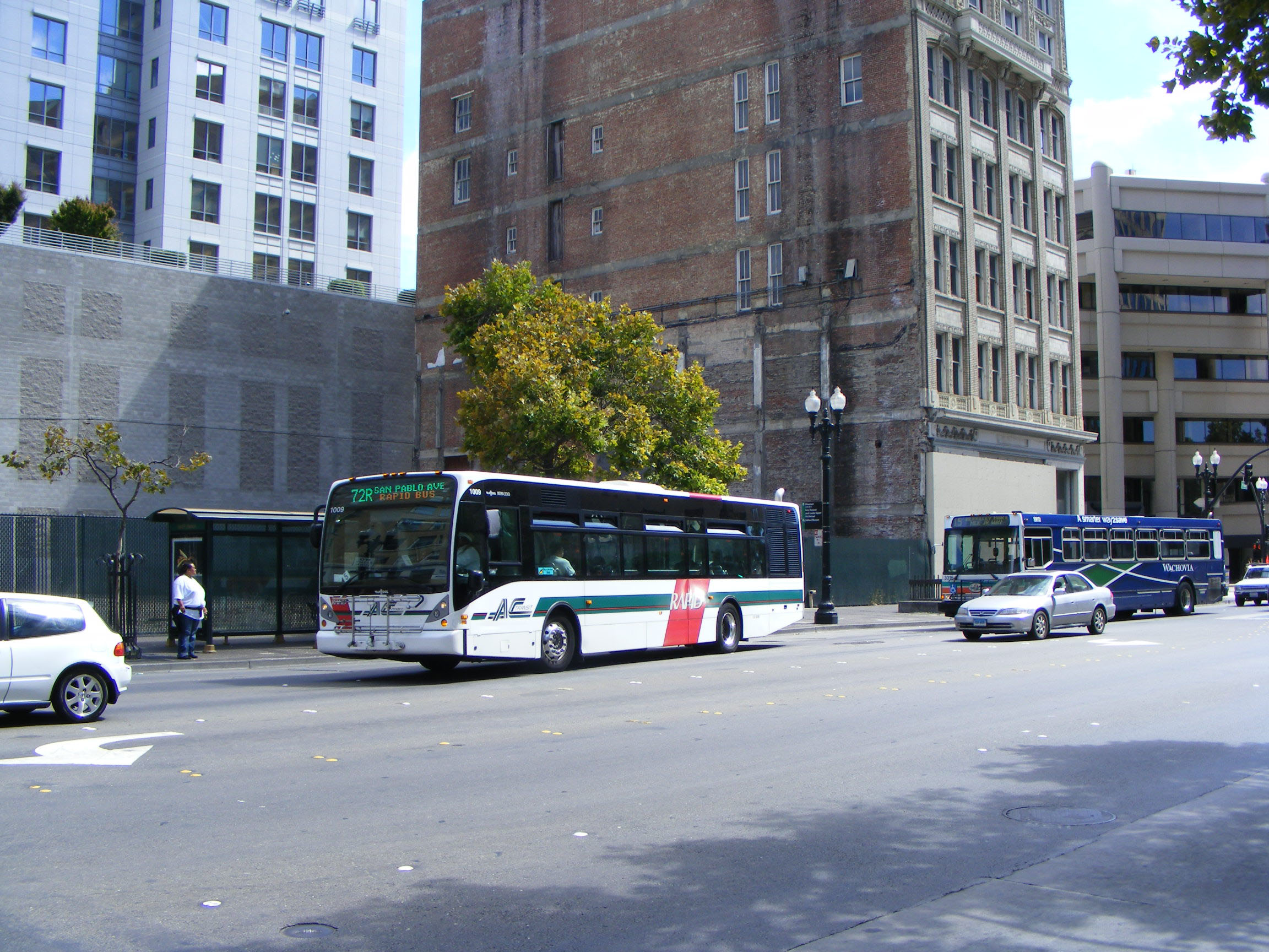 In 2003, AC Transit switched to new low-floor buses from Van Hool, purchasing A330 40-foot units like 1009 seen here in Oakland followed by NABI 3016 in advertising livery for Wachovia Bank.