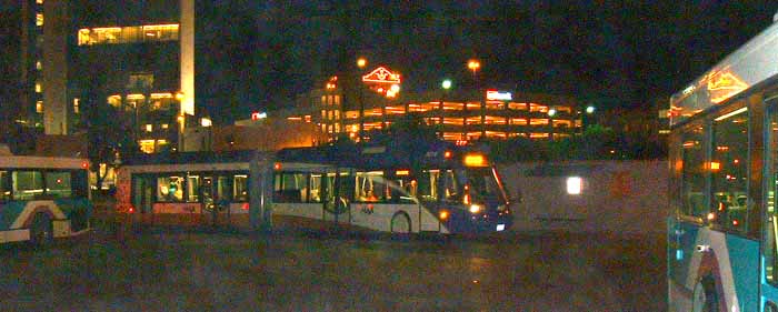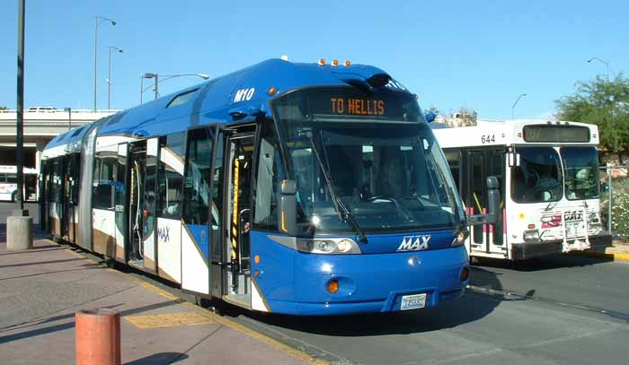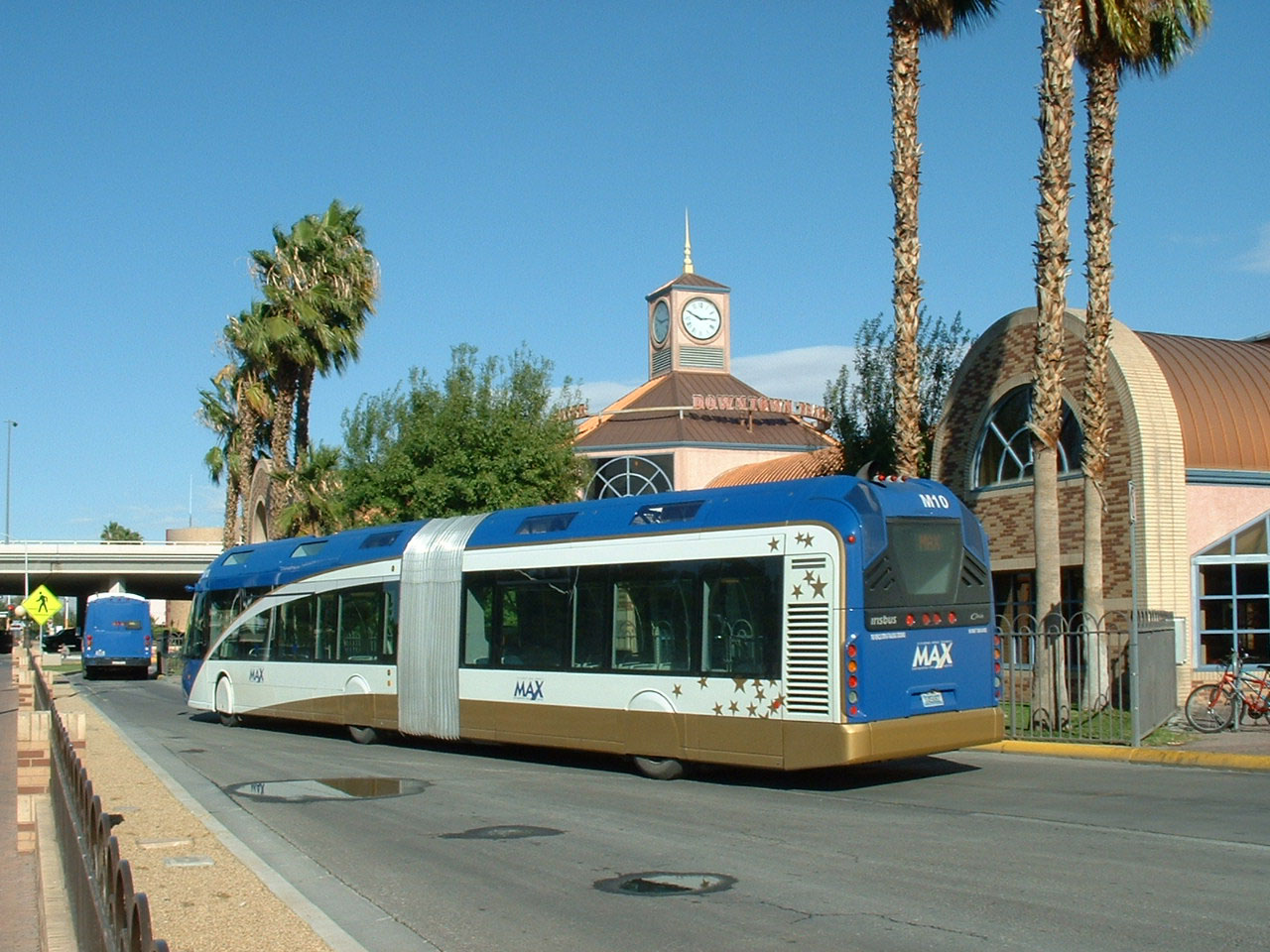 There could not be a greater contrast in styles between the old and the new. A high floor New Flyer, 644, plods by M10 in the fleet of RTC's CAT. M10 is an optically guided Irisbus Civi. The optical guidance takes over on the approach to bus stops to bring the bus just the right distance from the kerb for boarding and alighting. M10 and 644 are seen at the Downtown Transit Center.
