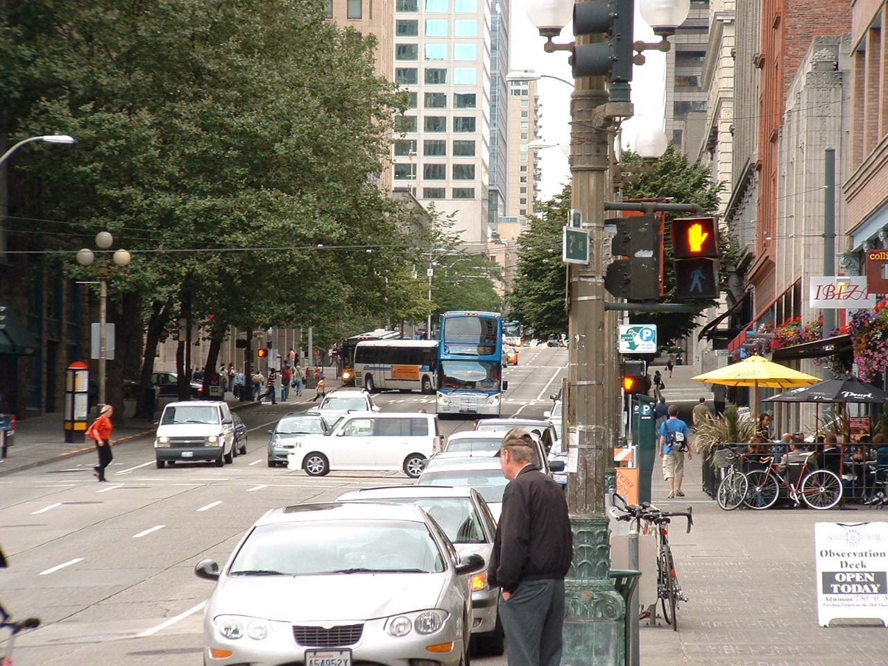 In due course the telephoto lens picked up the decker, threading its way through downtown traffic followed by an RTS of the fleet and a King Sound Metro Flyer. Following Las Vegas CAT, Community Transit became the second US operator to put modern deckers into regular passenger service.