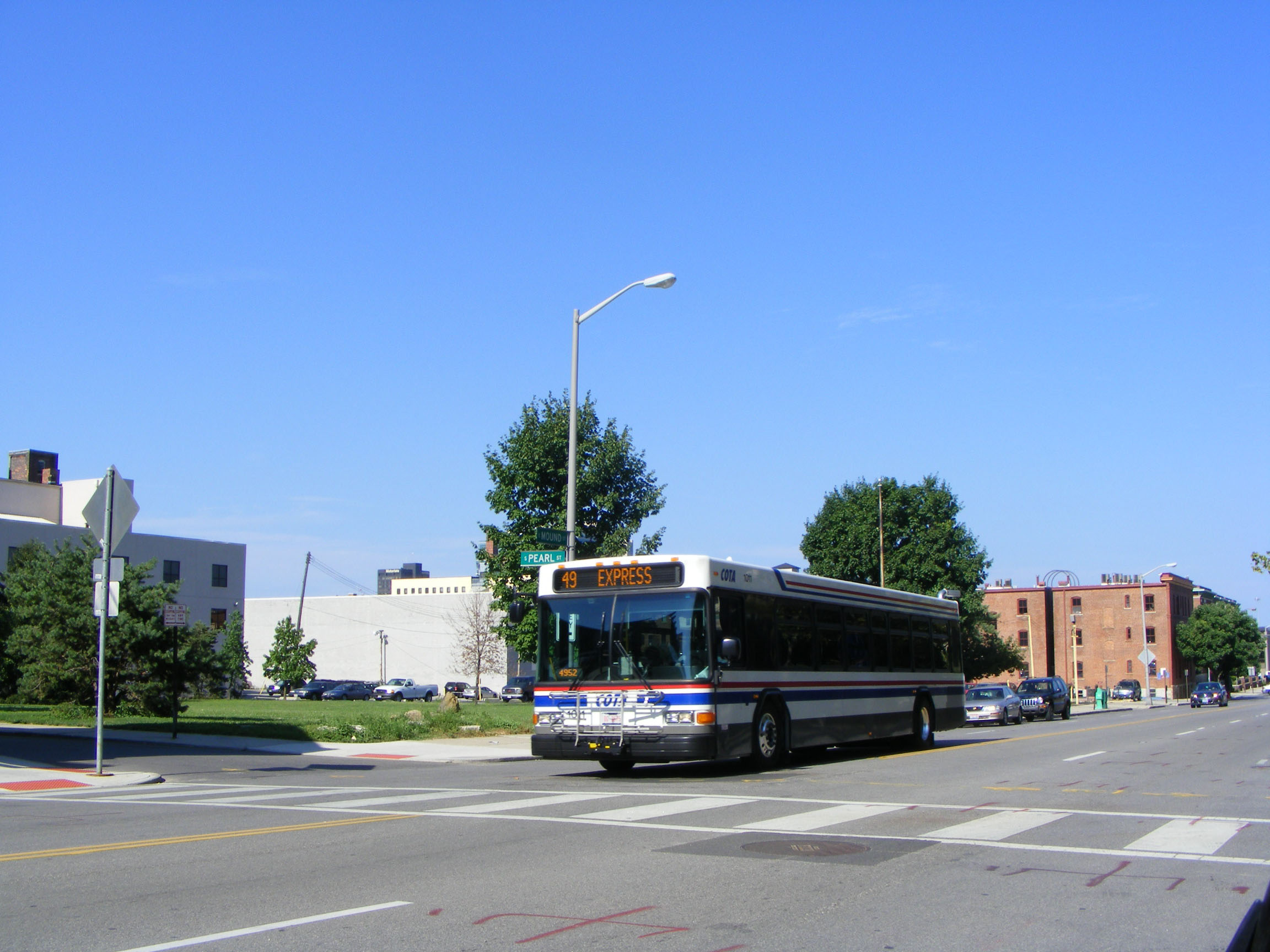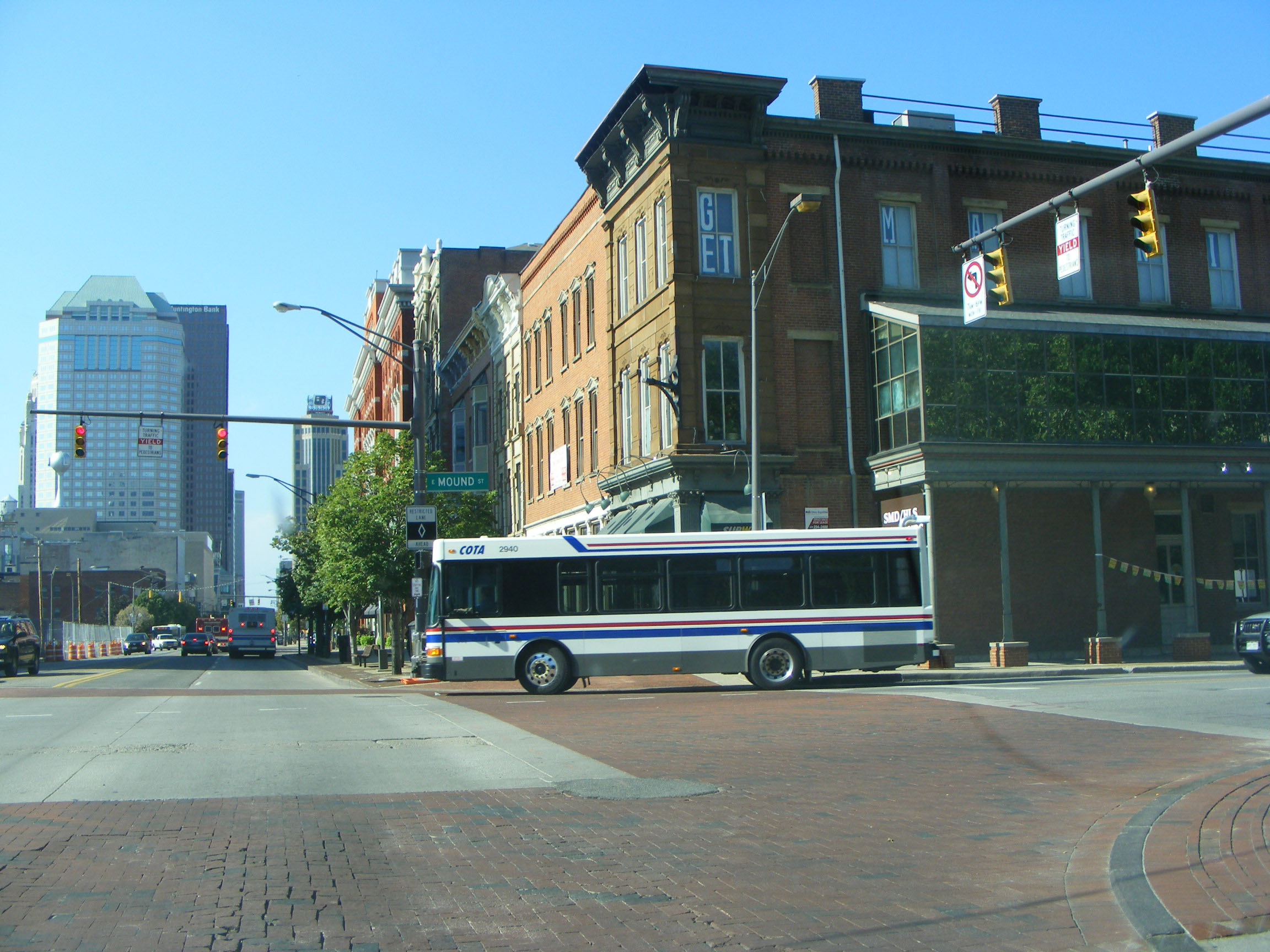 The Central Ohio Transit Authority is the main operator in the state's capital city, Ohio. The fleet is dominated by Gillig Advantage models including this mid sized example, 2940, seen in the city centre in late July 2010.