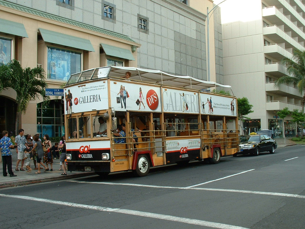 All manner of transport can be found in Hawaii from Enviro400 open toppers to trailers hauled by a tug. This doubledeck open top replica trolley seen in August 2004 predated the Enviros. Doubledeck mock trolleys are not unique to Hawaii but would be interested to know if such contraptions ever ran on rails back in the day.