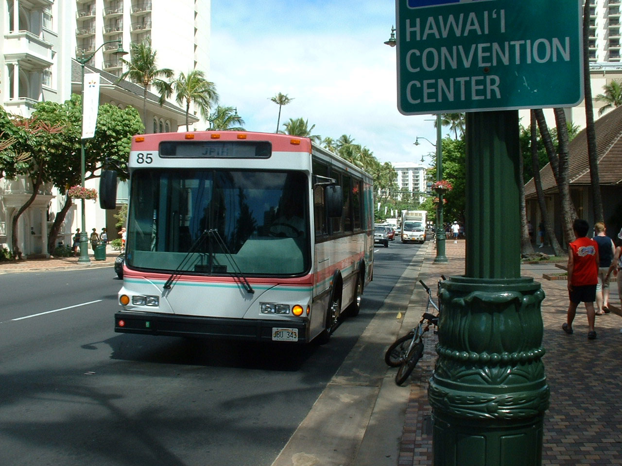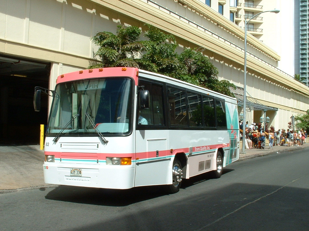 Seen in August 2004 is Trans Quality Inc 82, a bland unidentifable bus in Waikiki. The JPIH in the destination gives no clues to its purpose but the bus appears to have a large rear luggage compartment.