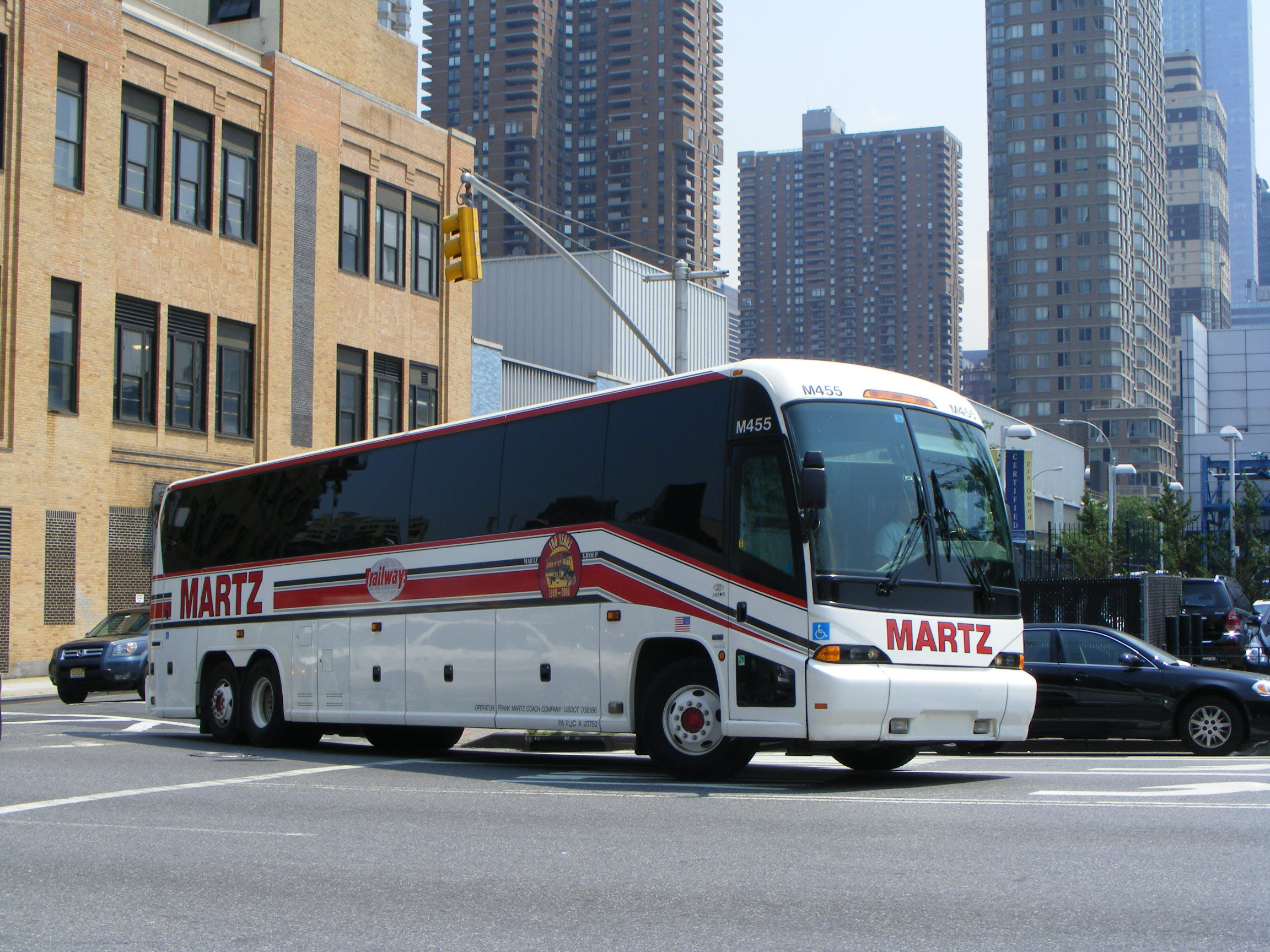 Sister vehicle, M456, is also seen in New York in July 2008, the year of the company's centenary. The logo on the side of the coach towards the front is a special commemorative decal.