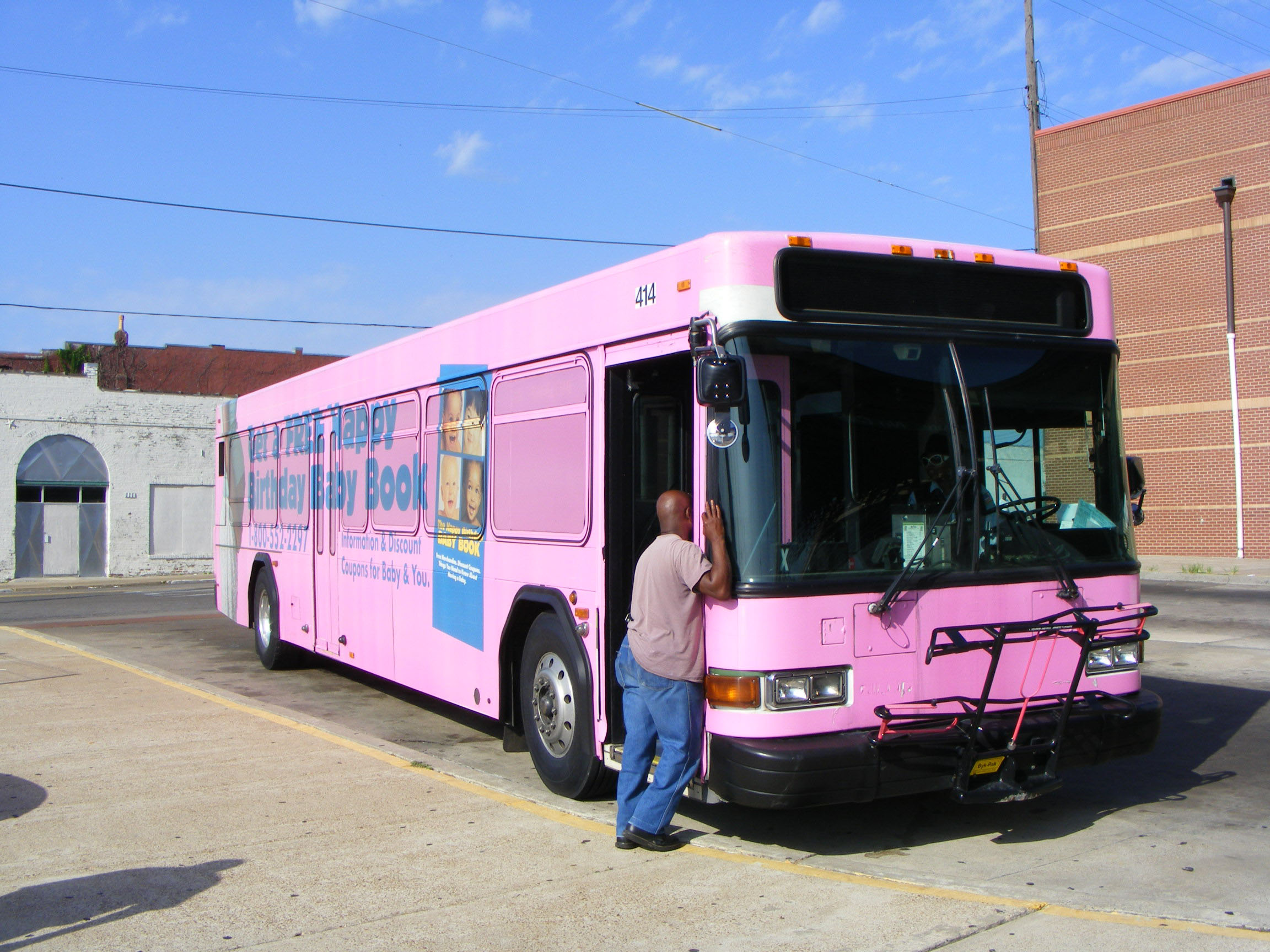 Someone must have tickled Advantage 414 excessively as the bus has turned pink! A number of the fleet carried all over advertising liveries.