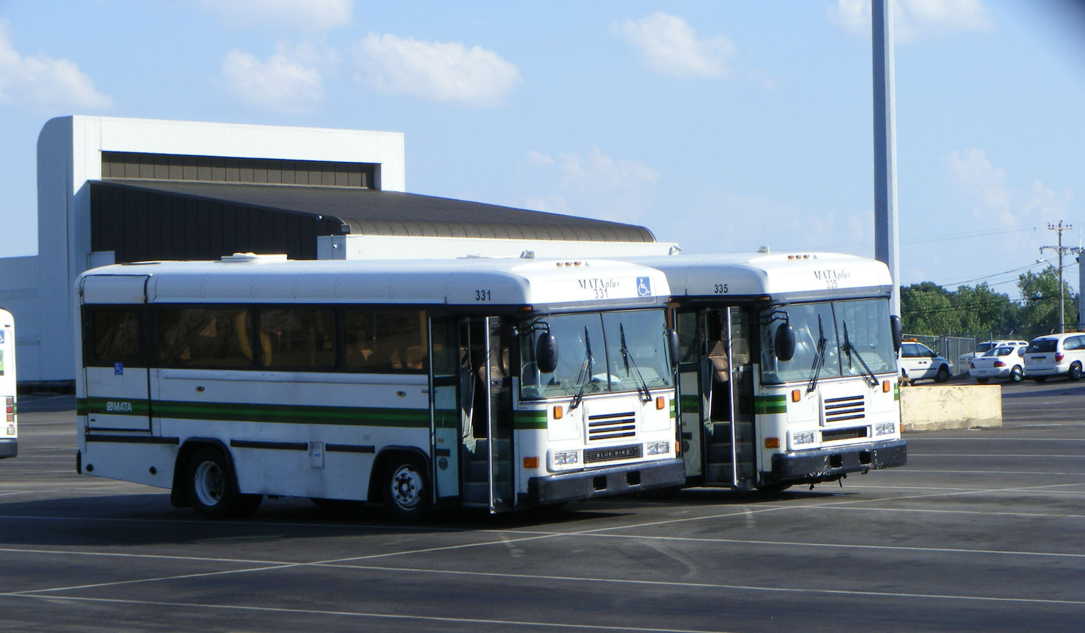 Odd choices for the disabled access MATAplus services are these examples from a dedicated fleet of short Bluebird buses more usually used as school buses. Here are numbers 331 and 335 in the depot yard. Wheelchair access is via the nearside rear door.