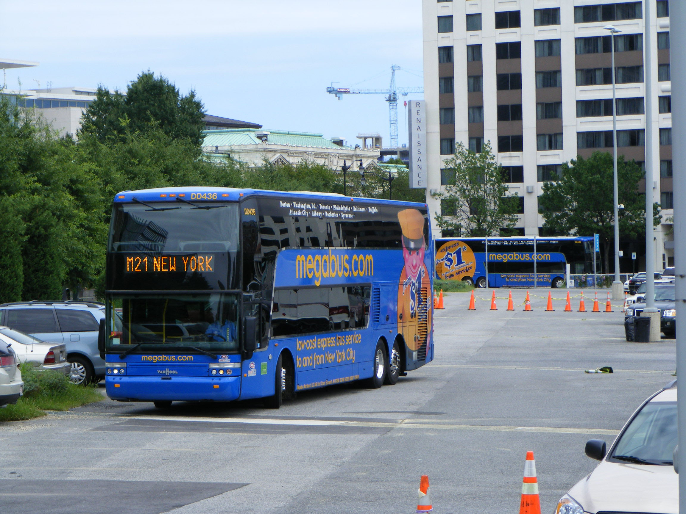 The Washington terminus is a busy place. It is an open air car lot which appears to be designated to development by Bloombergs. Used by both Megabus and BoltBus there appears to be a never ending stream of buses coming and going. Often several Astromegas can be seen simultaneously. Here DD066 has arrived on the M21 from New York via Baltimore whilst DD444 awaits departure on the M23 for Philadelphia. |
