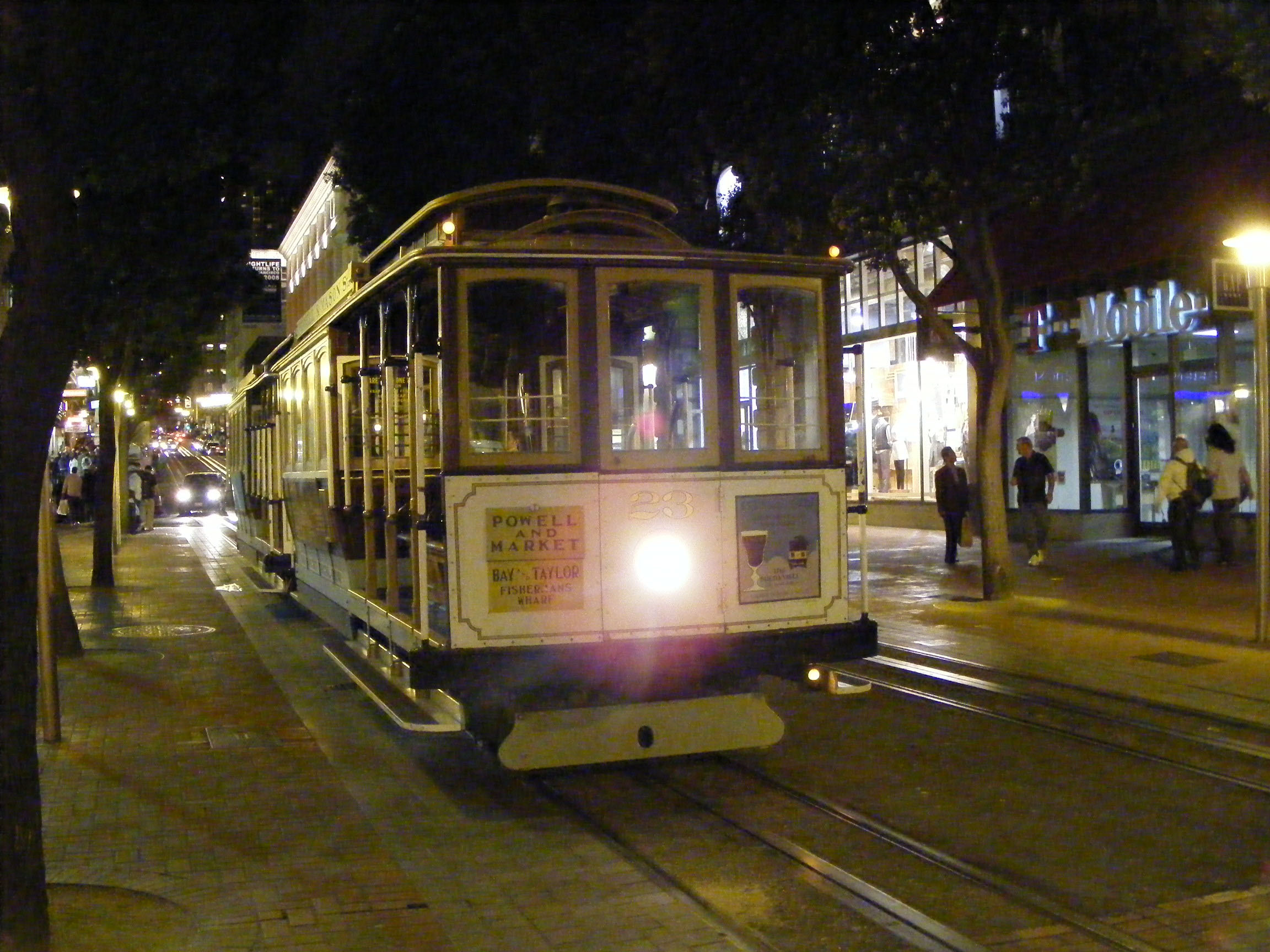 This is where it all starts. Car 26 prepares to swing round at the downtown Market Street terminus to head up the hill to Bay & Taylor. The queues lining up for the ride will probably be travelling after several more departures after 26 has left. The scene could be any time, but was 1981, before the system was closed for its big renovation over the next 3 years. |
