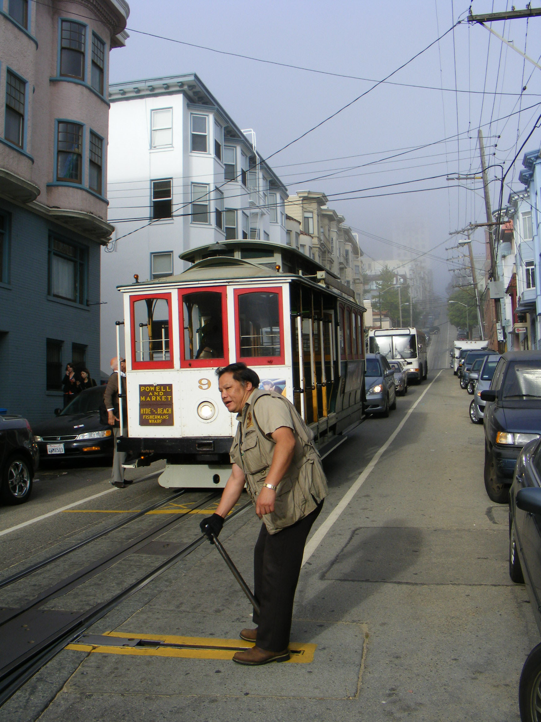 Car Number 2 another six years on and dealing with a bit of an incident. It is early morning in San Francisco in August 2008 and the cable between Powell & Market and the cable car sheds has broken. The bus behind is performing a link service with the helpful destination "Naval Dockyards" - it also departed a block away from Powell & Market with no obvious sign of its purpose - and car 2 was awaiting any passengers who might have discovered the bus to continue their journey on the section of cable that was working.