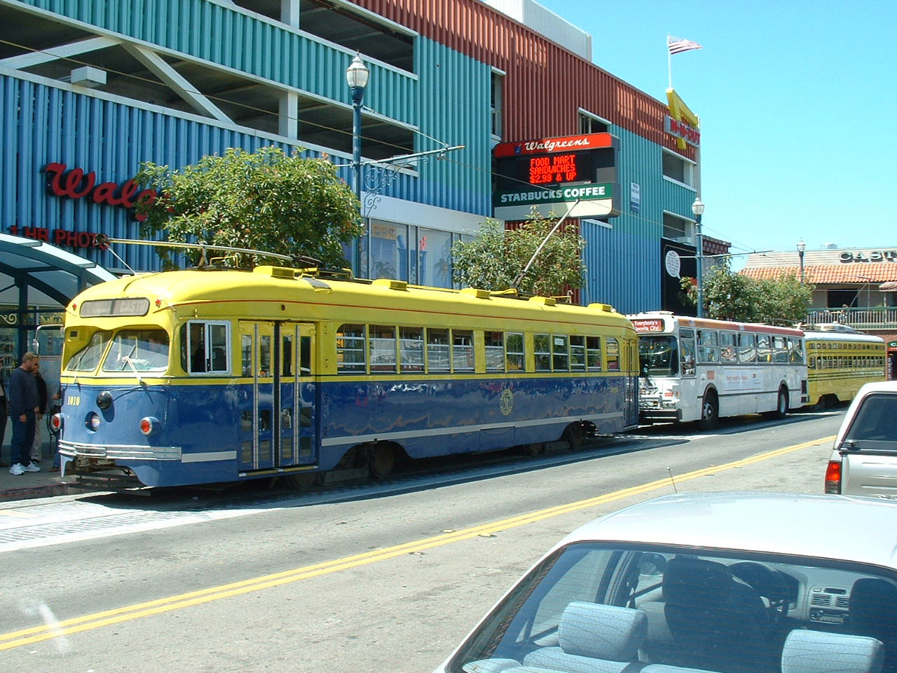 Car 1010 approaches the icon of Fishermans Wharf in August 2002. The tram has been restored to the MUNI livery of the thirties. |