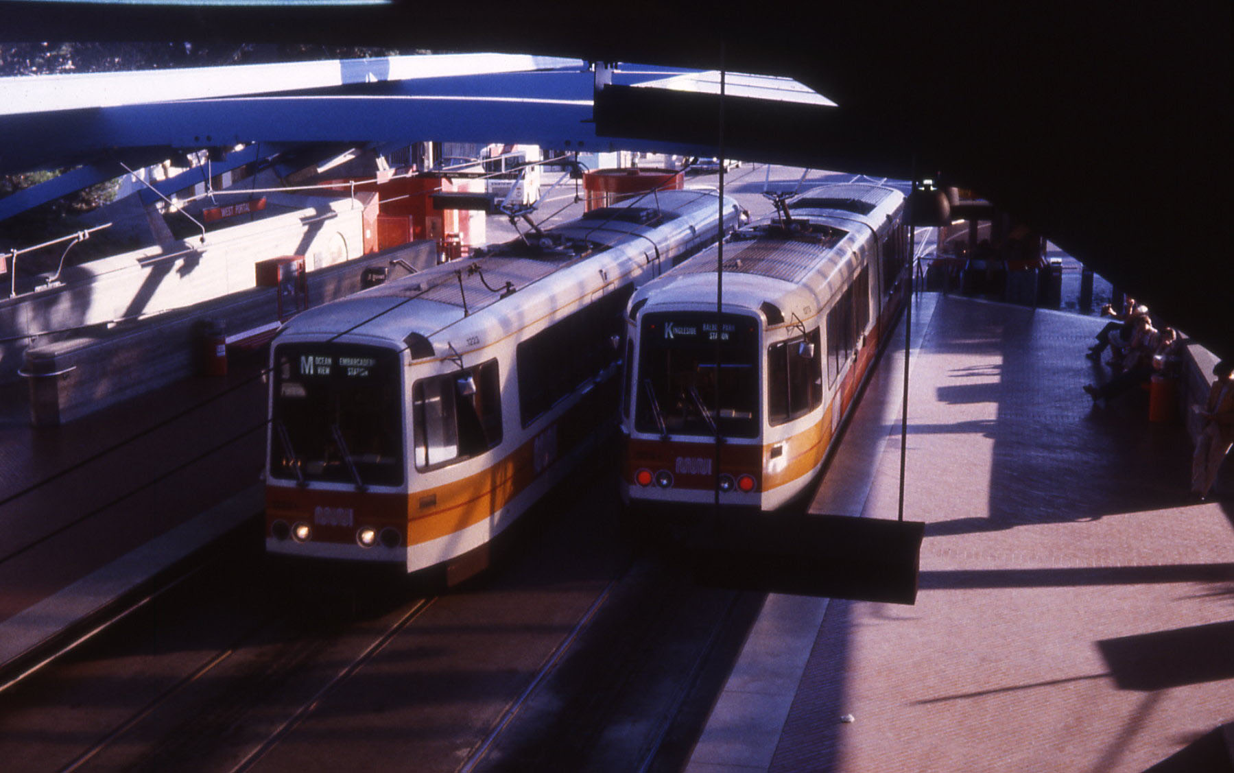 August 2004 at the West Portal MUNI Boeing streetcars 1176 and 1223 pass at the station. Boeing 1176 on the right is heading out on line K having decoupled from other cars after its subway journey. On the left 1176 on line M is about to couple with other cars for a subway ride downtown.