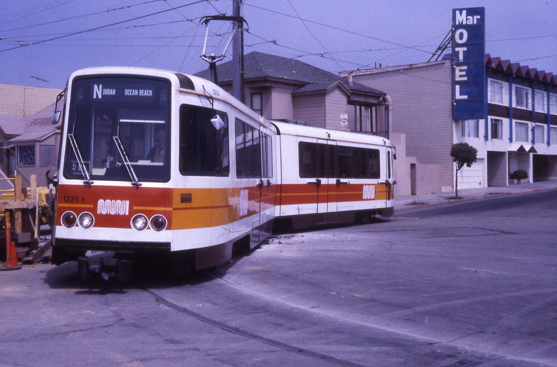 Boeing streetcar 1225 out on the streets of San Francisco having emerged from the downtown subway system it is on line N to Ocean Beach.
