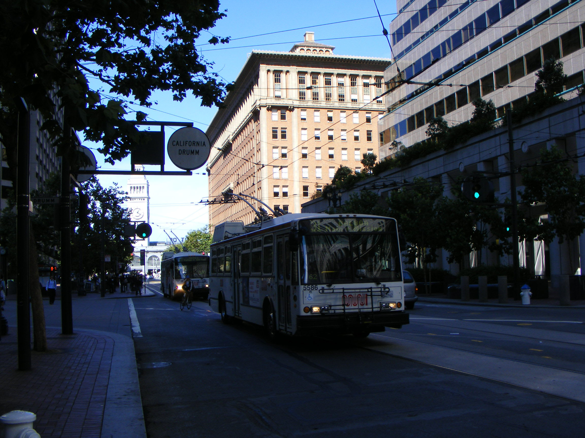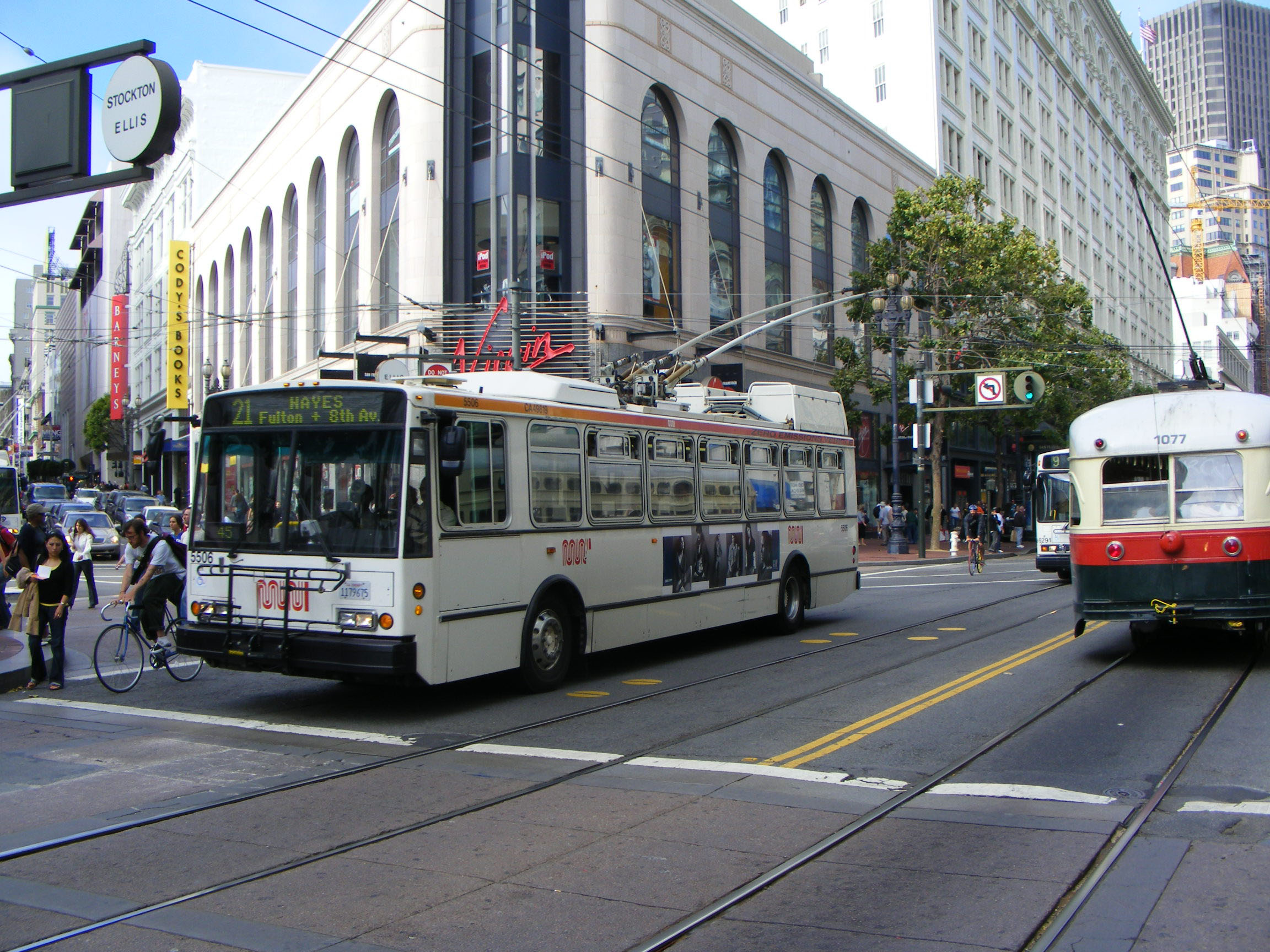 MUNI 5506 mixes it on Market with one of the old streetcars - 1077 - a cyclist and a bus.