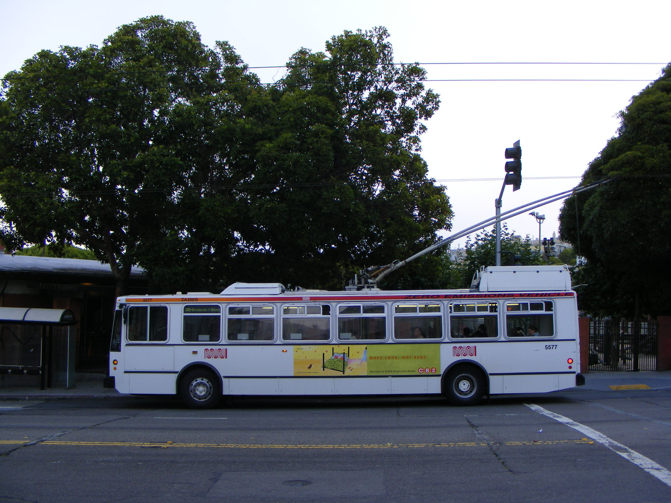 A broadside view of trolley 5577 showing the fade in the band above the windows from orange to red and the legend, much loved in California, "Zero Emission Vehicle".