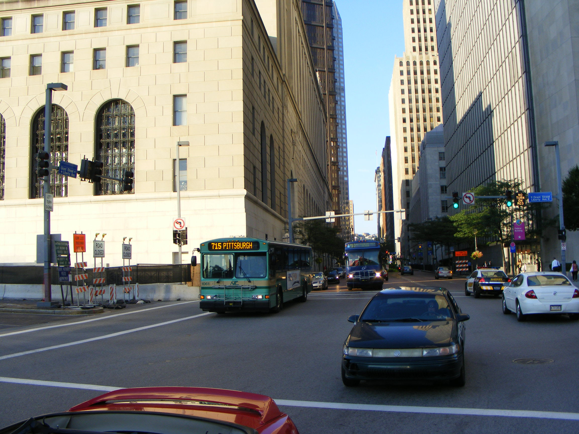 Half an hour later Gillig 128 is heading back to New Castle, passing the main Pittsburgh Greyhound Terminal.