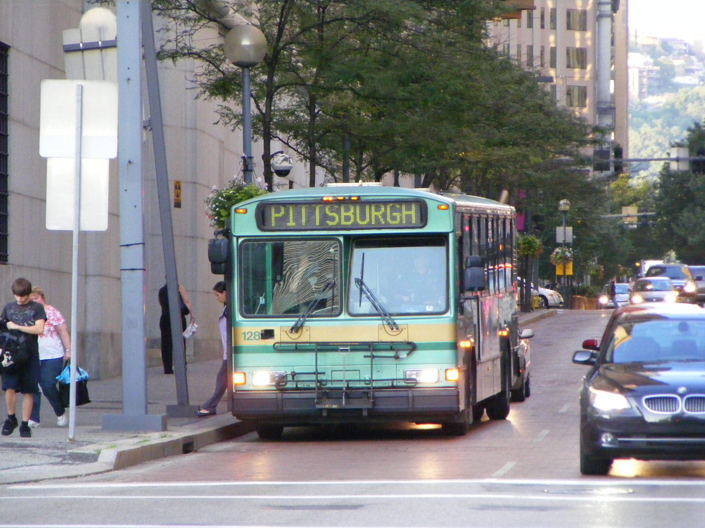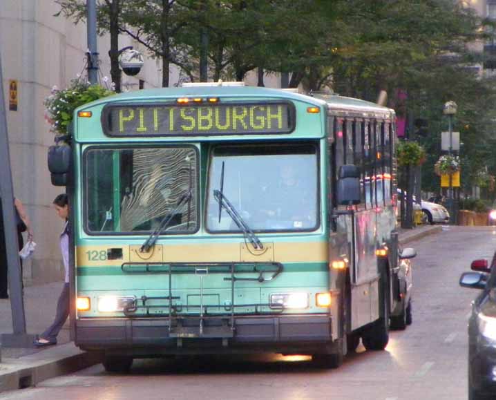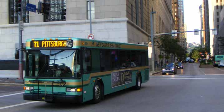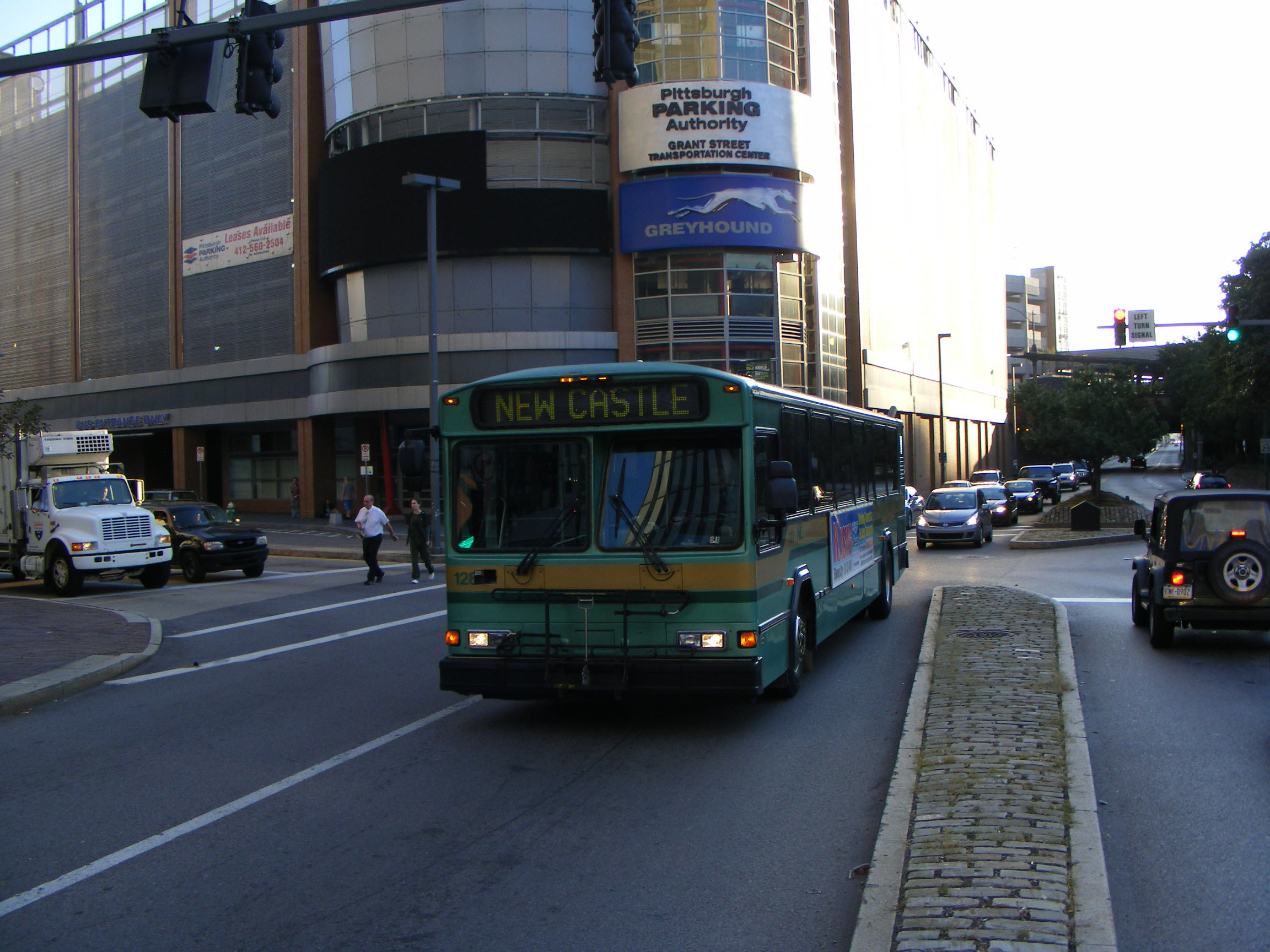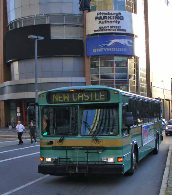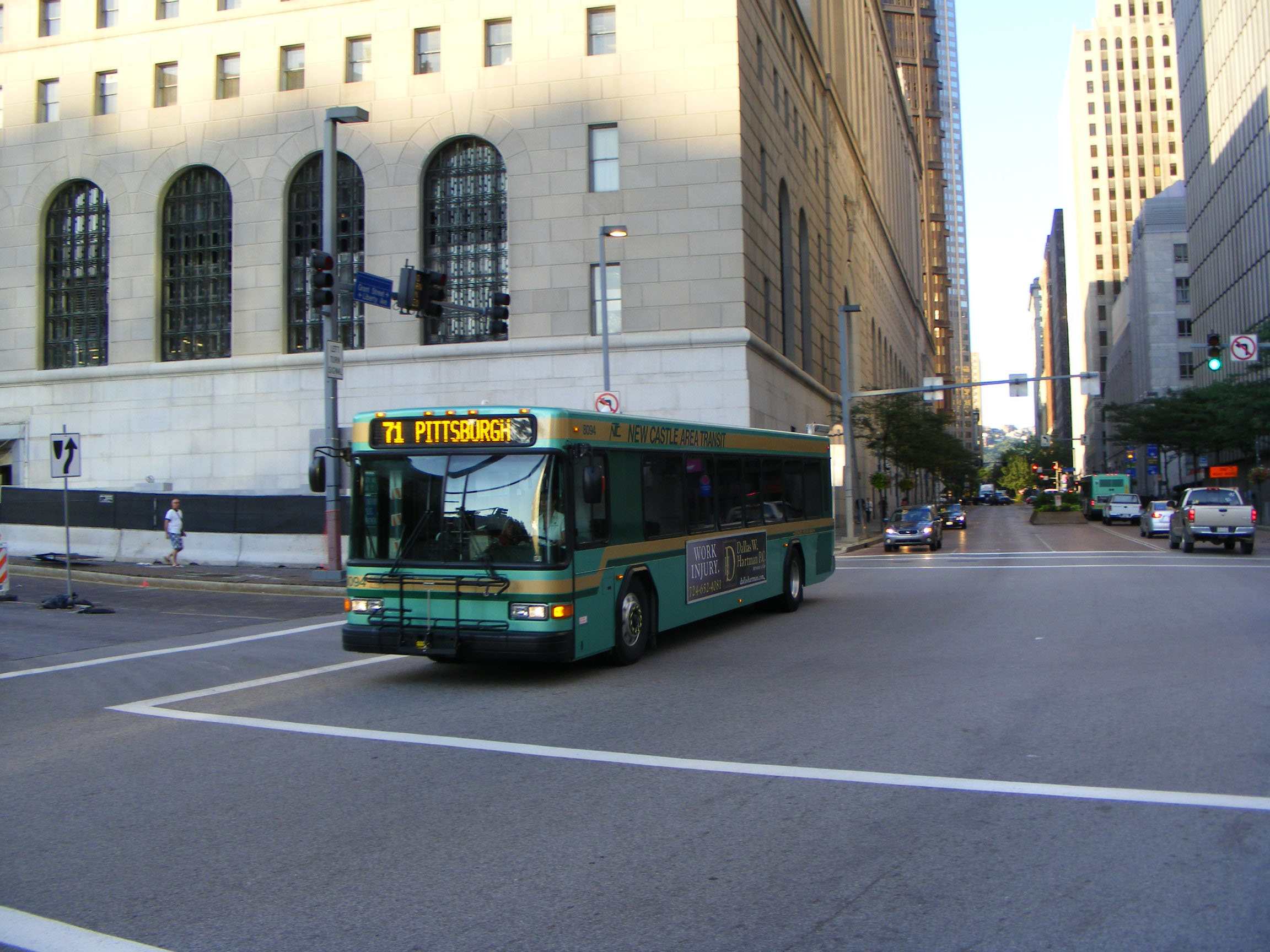 New Castle Area Transit Authority operate a small fleet of buses, some of which work on commuter routes into Pittsburgh. Here Gillig Phantom 128 is on a morning run back into the city in July 2010.