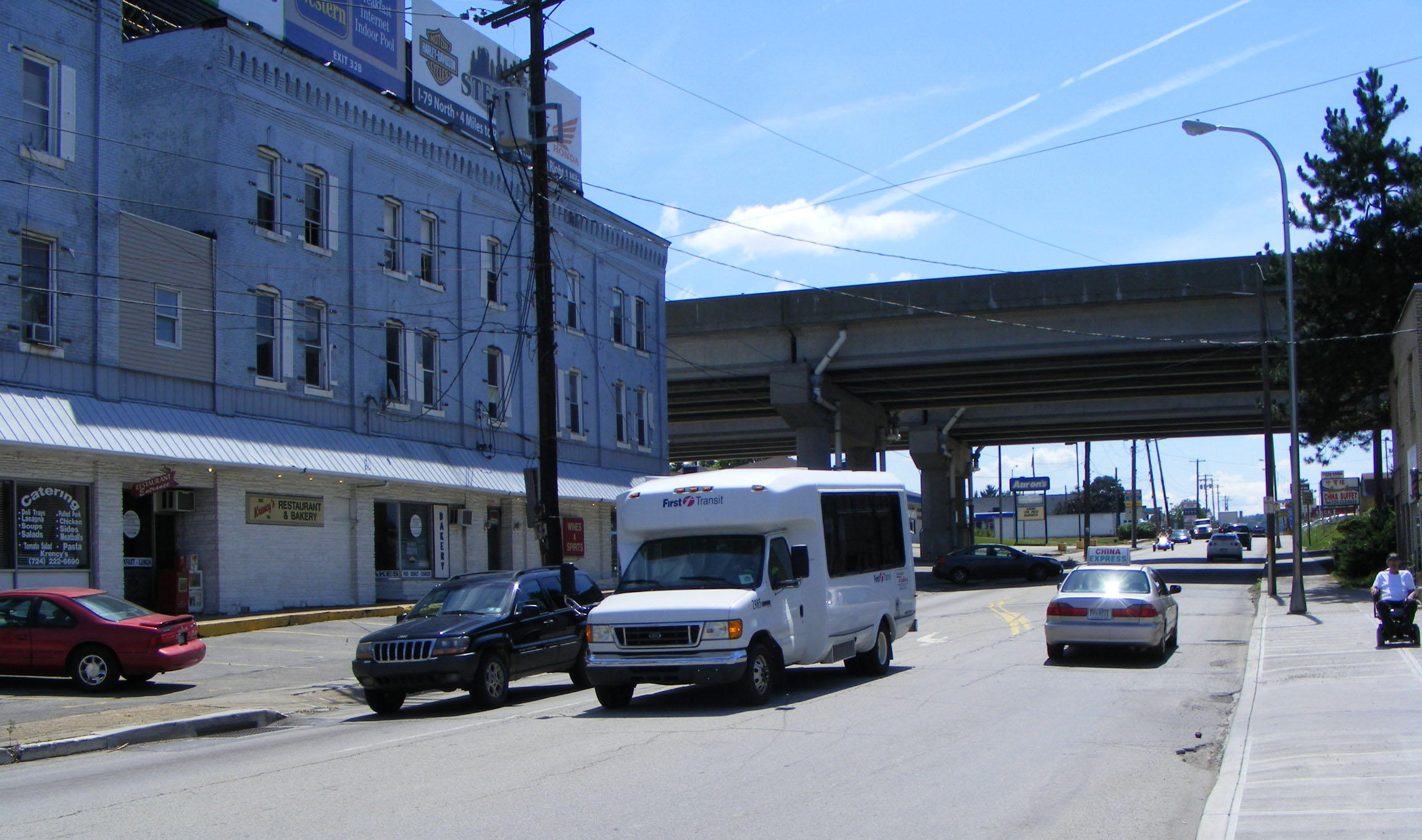 The extent of First's operations in the United States is often overlooked from the UK and probably not that obvious to Americans. Besides the high profile Greyhound operation, and the less high profile, but equally widespread First Student services large numbers of American "municipal" operations are managed discreetly by First Transit. Less discreet is the First Transit branding on the town service network provided in Washington, PA. This is a very small set up though, dwarfed by the Paratransit operation, for example, in nearby Pittsburgh. This Ford bus is seen in Washington in July 2010. |