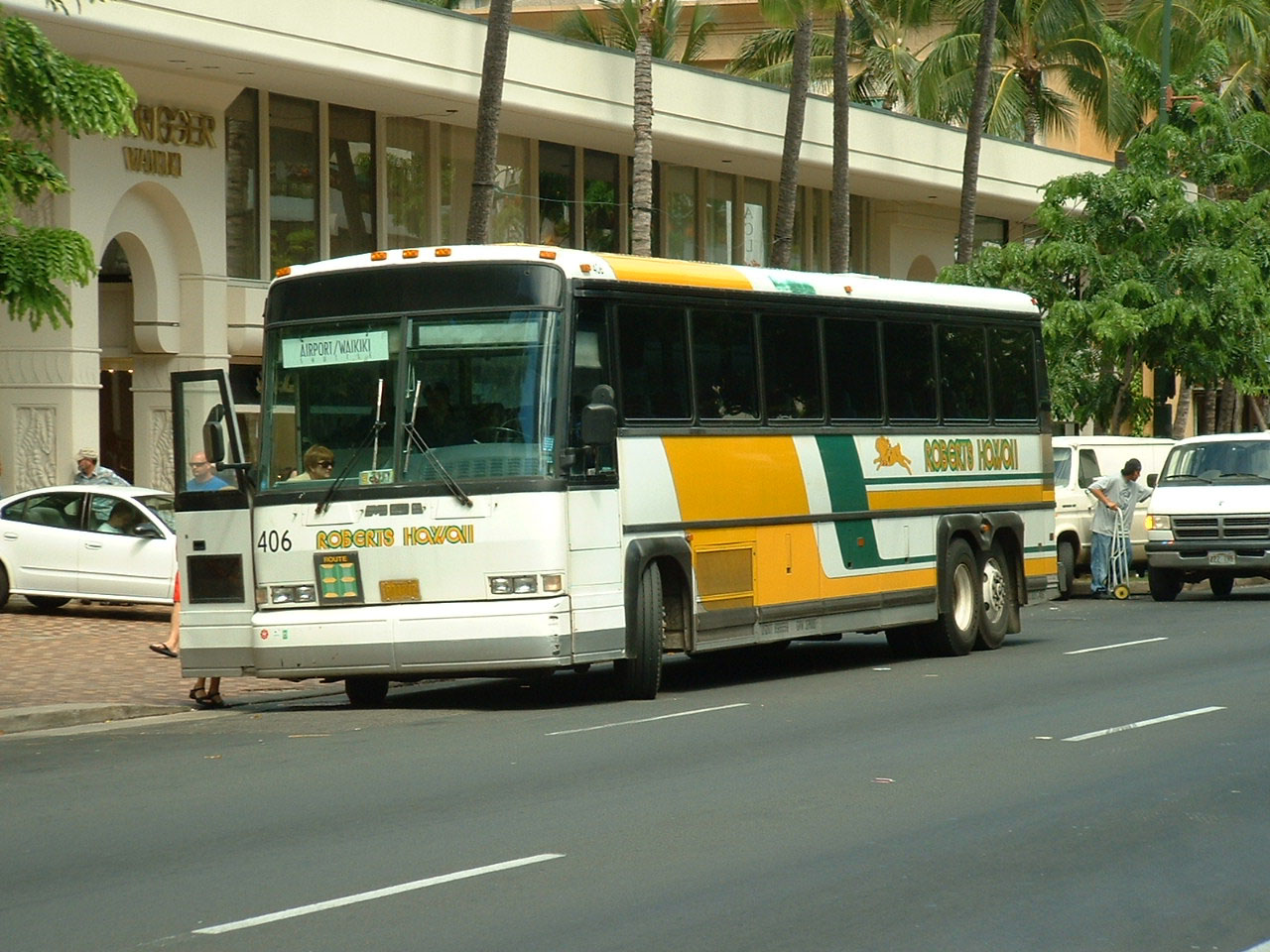 In December 2010 Roberts took delivery of ten Prevost H3-45 motors, and this one is seen from the hotel balcony, cruising Waikiki Beach.
