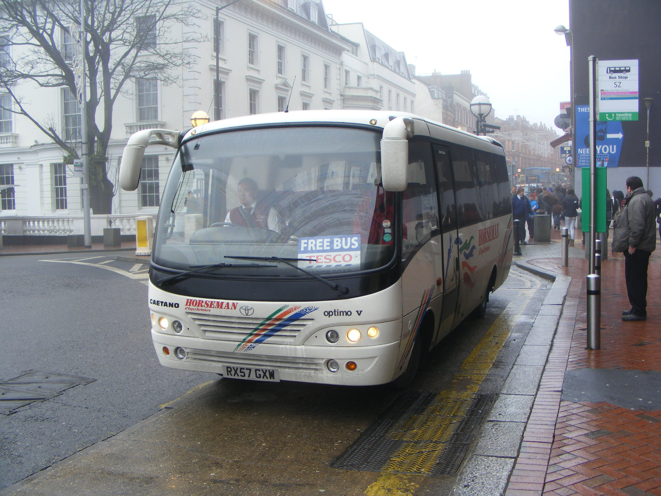 Working a free shuttle for Tesco near Reading Stations on a damp day in December 2010 was this Caetano bodied Toyota Coaster, perhaps not the best vehicle for passengers laden with shopping, but neither would be a Plaxton bodied Volvo coach.