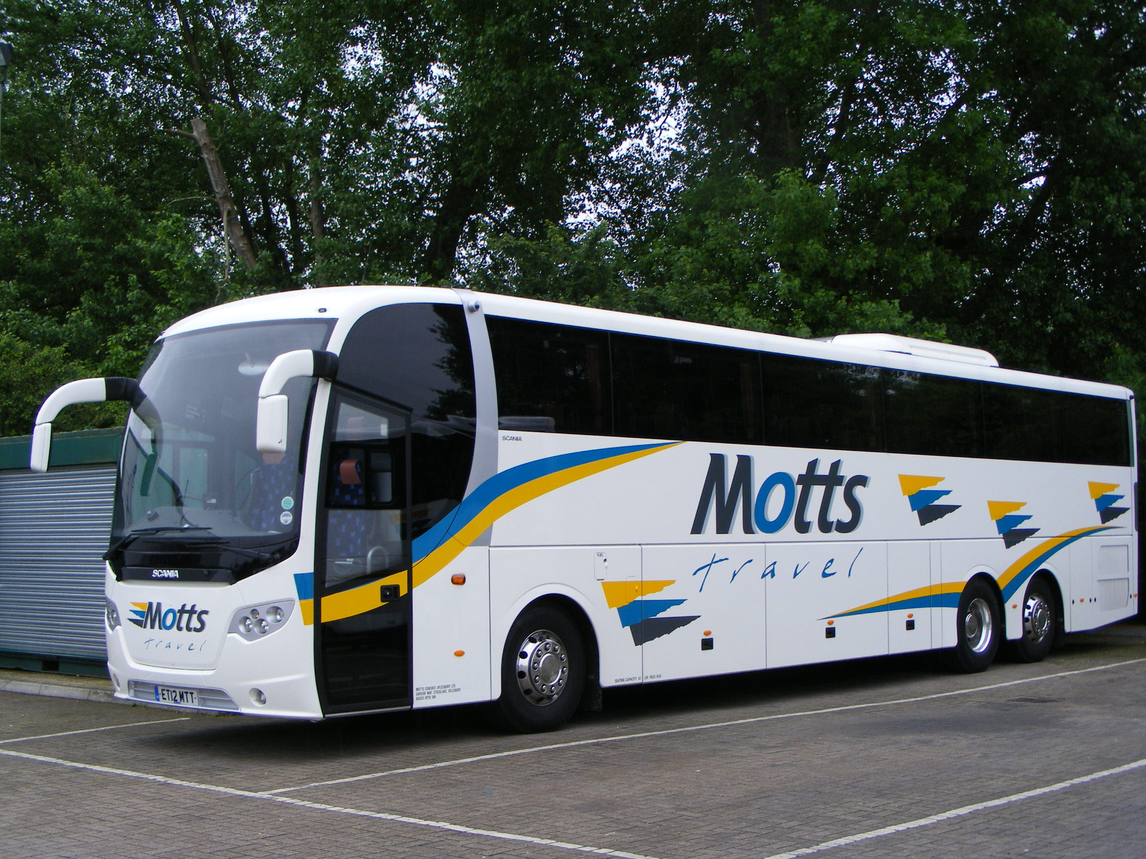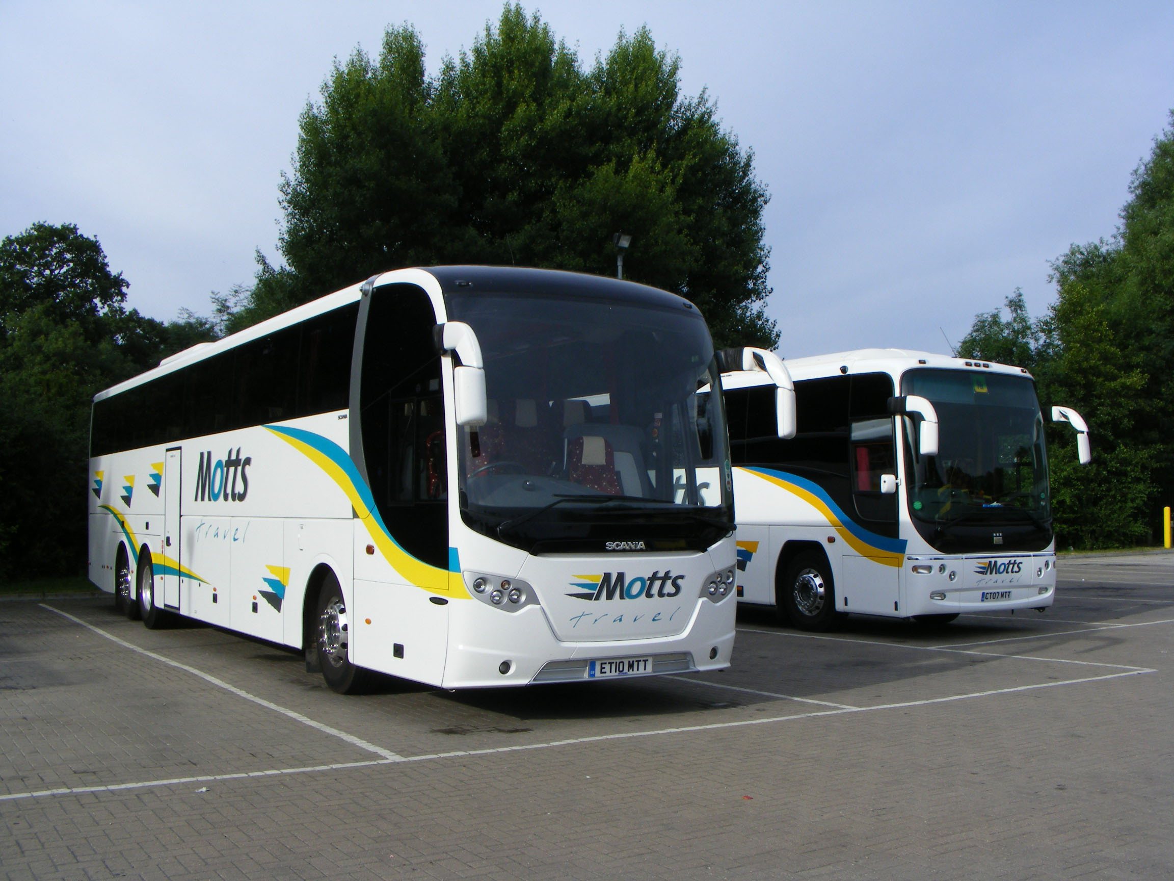 Seen when just three months old was the first of several Scania OmniExpress coaches purchased, ET10MTT. The enormous 63 seat tri-axle machines saw off the doubledeck coaches. Alongside is one of the ex Logan Plaxton bodied B12M Volvos with newly applied fleet livery.