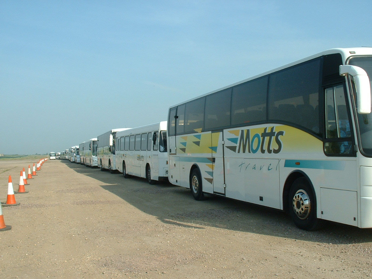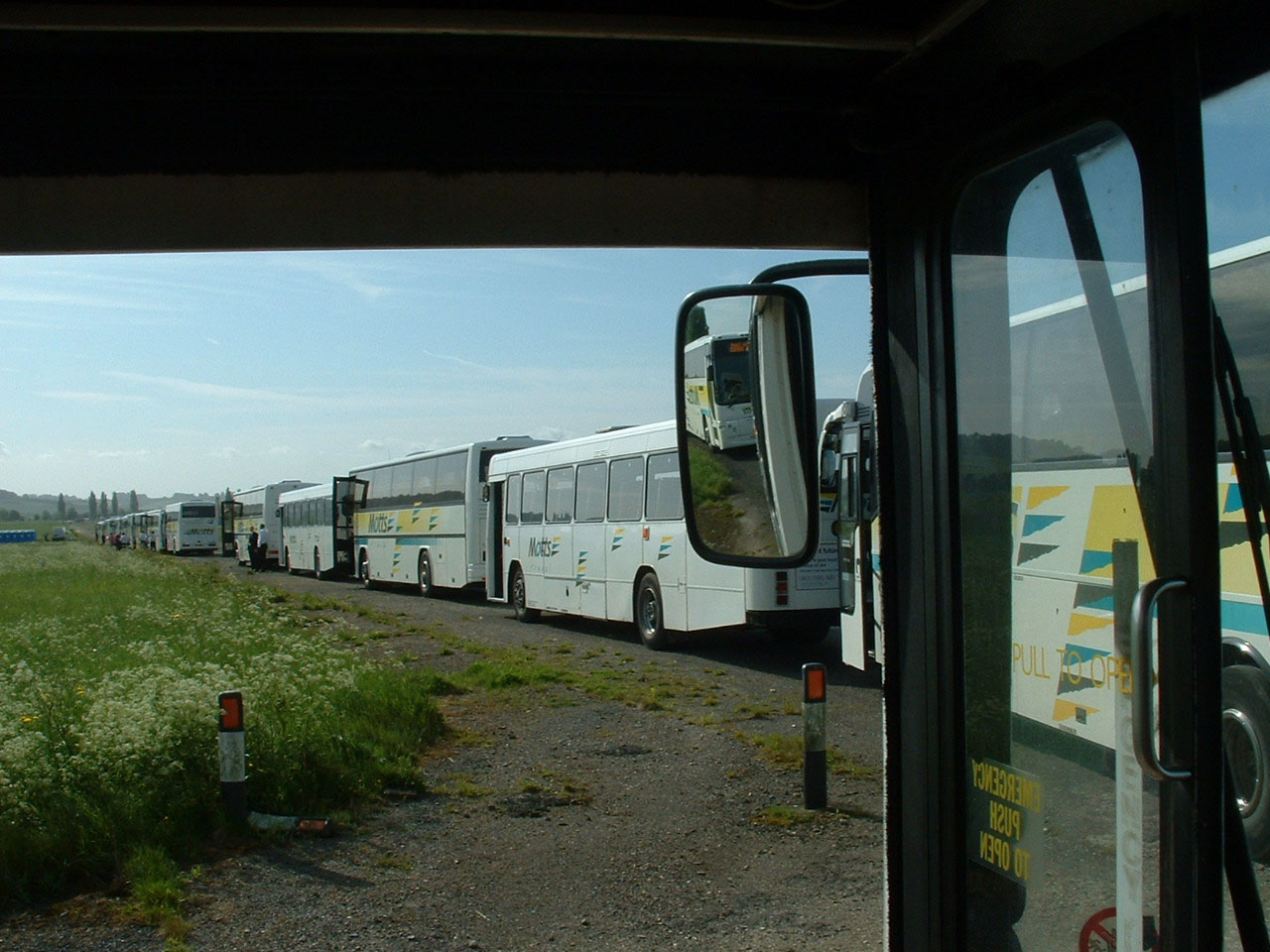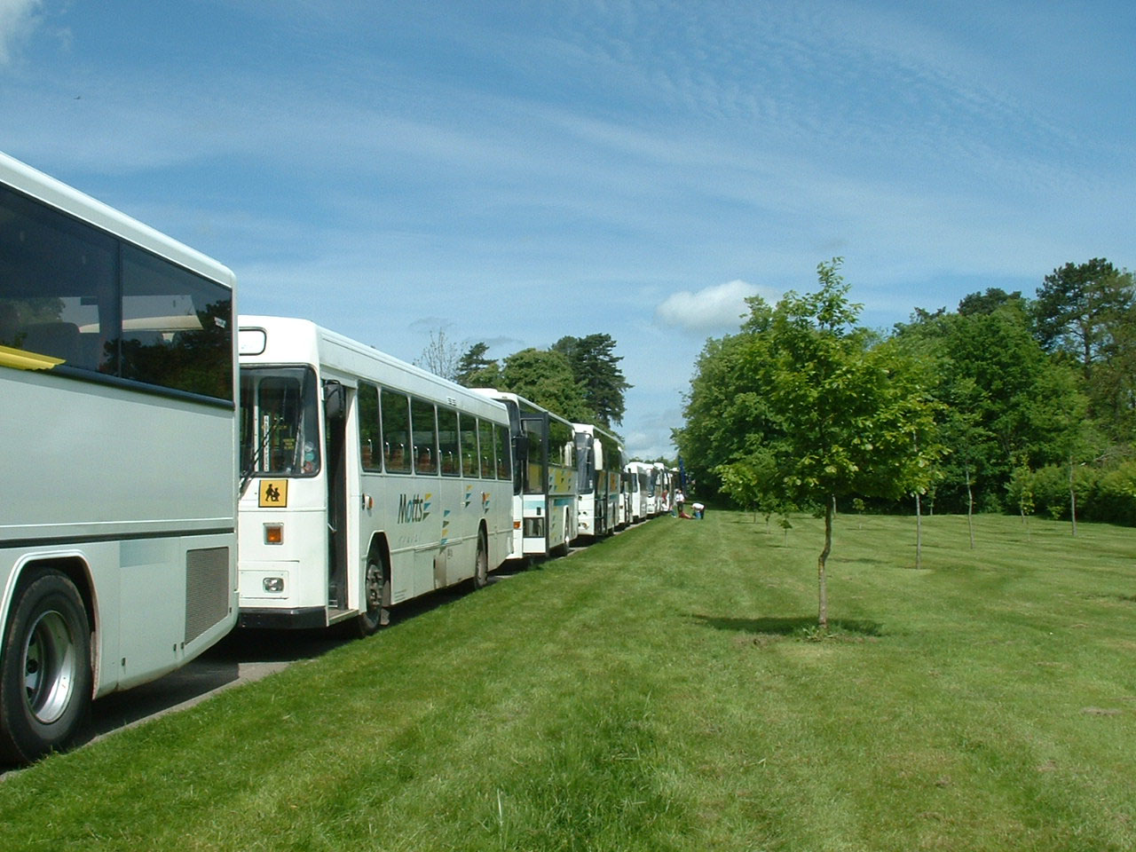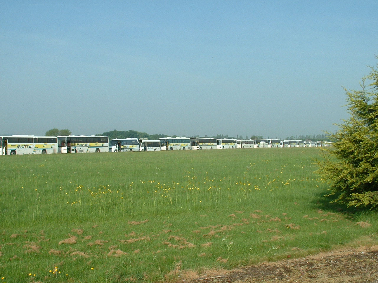 Having rescued the Race for Life Park & Ride a few years earlier, it became an annual fixture in Motts' calendar and they shifted to making it an entirely in house operation and many of the fleet were deployed on the appropriate Sunday morning in May. Here are the assortment of vehicles lined up at Westcott ready for the start of action and seen from the door of one of the Alexander bodied Leyland Tigers, several of which were taking part in the operation.