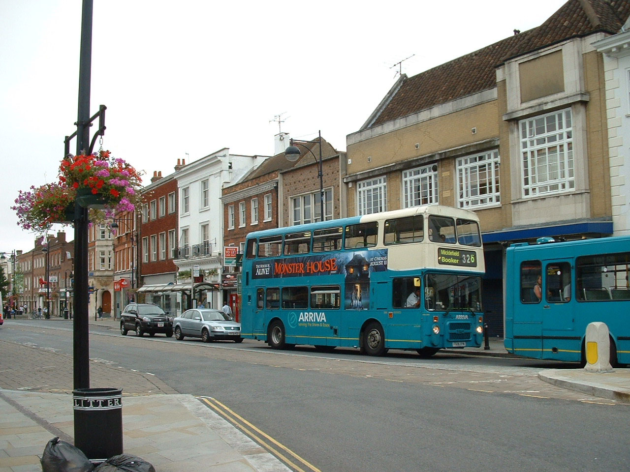 Volvo B6 3138 (L922LJO) in full Arriva colours, is seen at Quoitngs Square, the old Marlow terminus, in November 2007 on an "800 short". When the Reading services were renumbered from 328 and 329 to 800 and 850, the off peak service between Marlow and Wycombe was increased to half hourly with extra 800 journeys but were later abandoned in favour of a twenty minute service through to Reading, which was reduced forther to half hourly in 2015. |