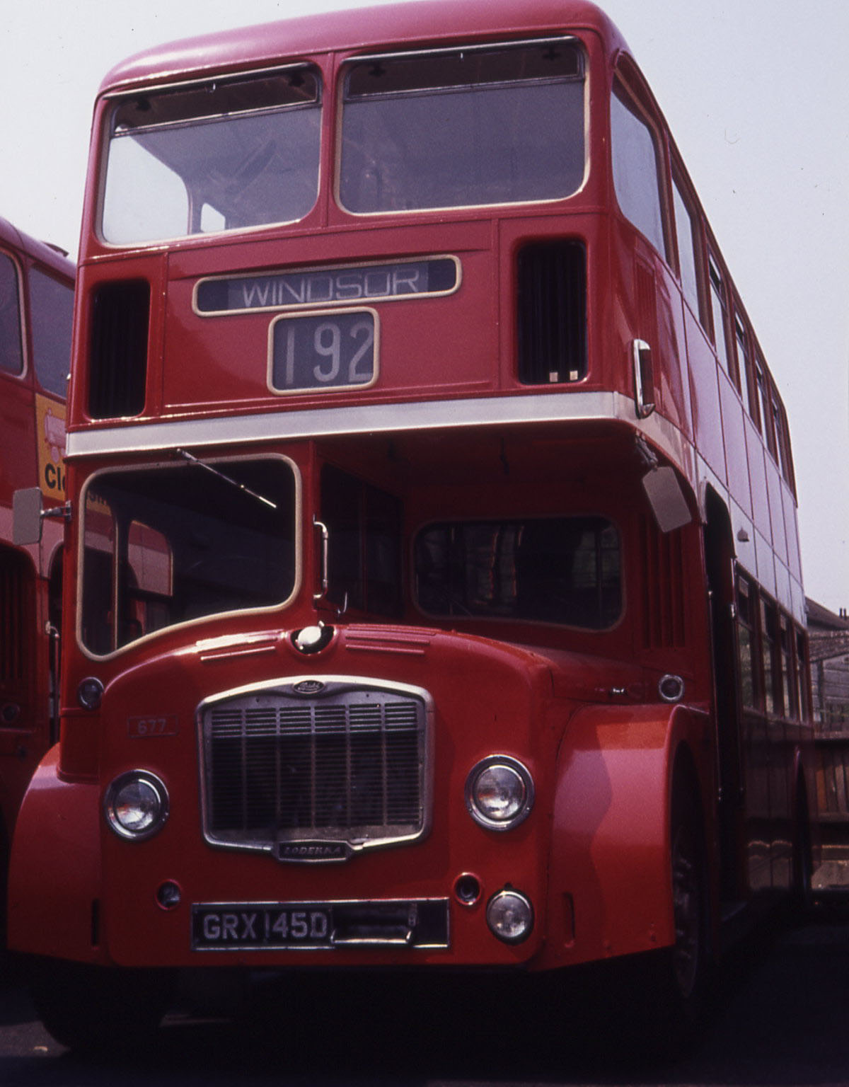 Lodekka 677 (GRX145D), formerly D45, is seen in NBC red at Reading depot.