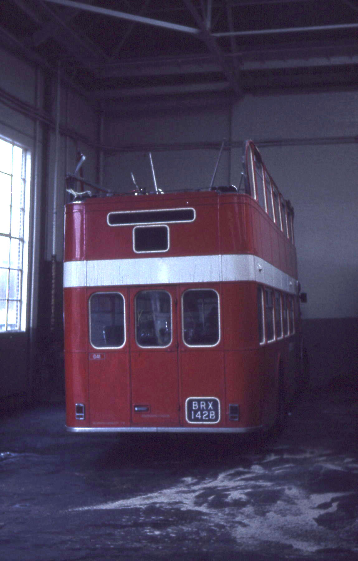 A second Lodekka from the 1964 delivery also came to grief three years later in 1976, D9 (BRX142B), AV 641> The bus encountered the canopy of a petrol station in Bracknell. It is seen squirreled away out of sight in Reading depot before being transferred to Southern Vectis, where it became their open topper OT6. It subsequently was exported to Arizona, USA.