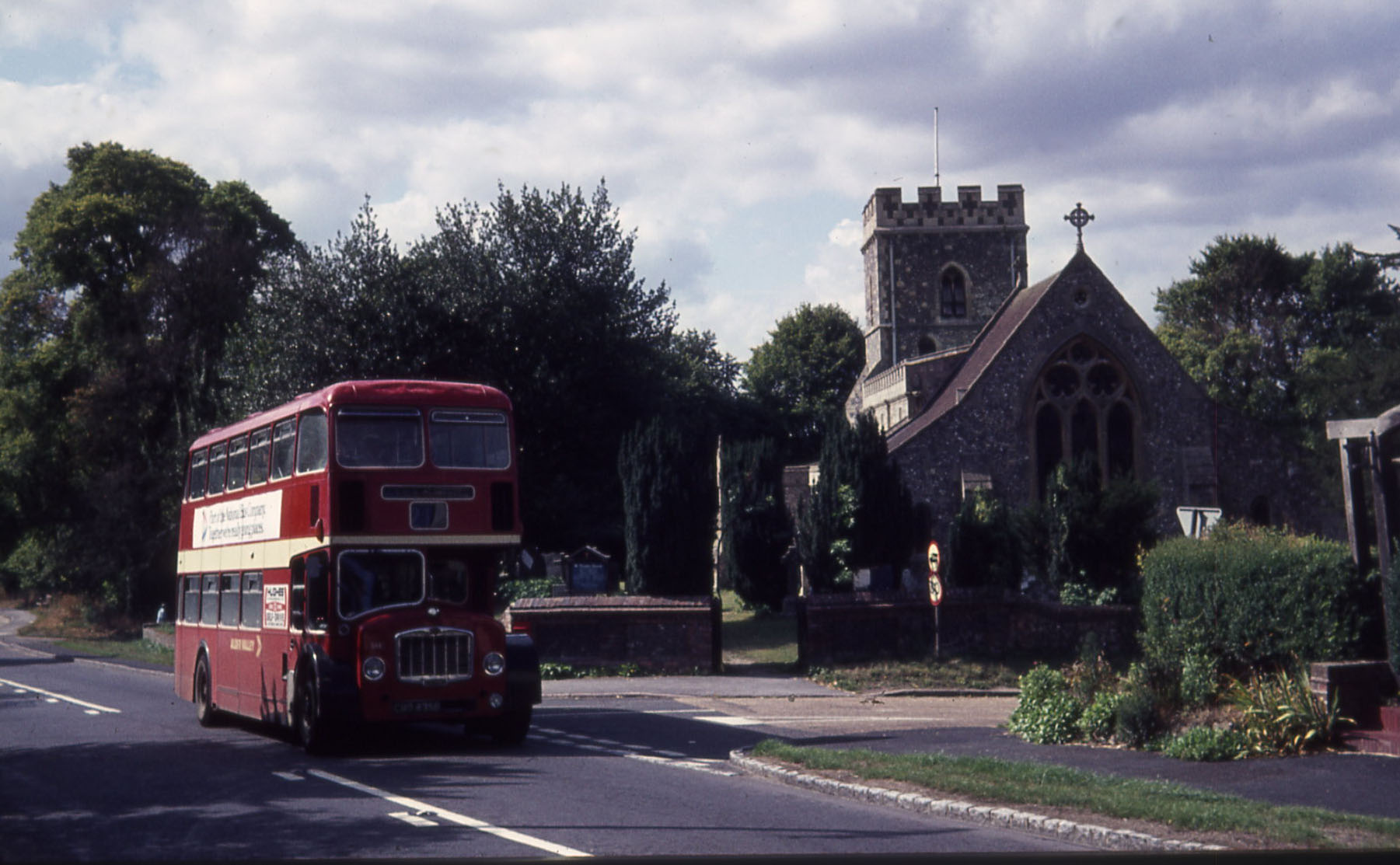 Lodekka 644 (CMO835B) was repainted in Ribble red and subsequently acquired NBC fleetnames in cream. It is seen here passing Great Kimble church in the mid seventies on service to Aylesbury. |