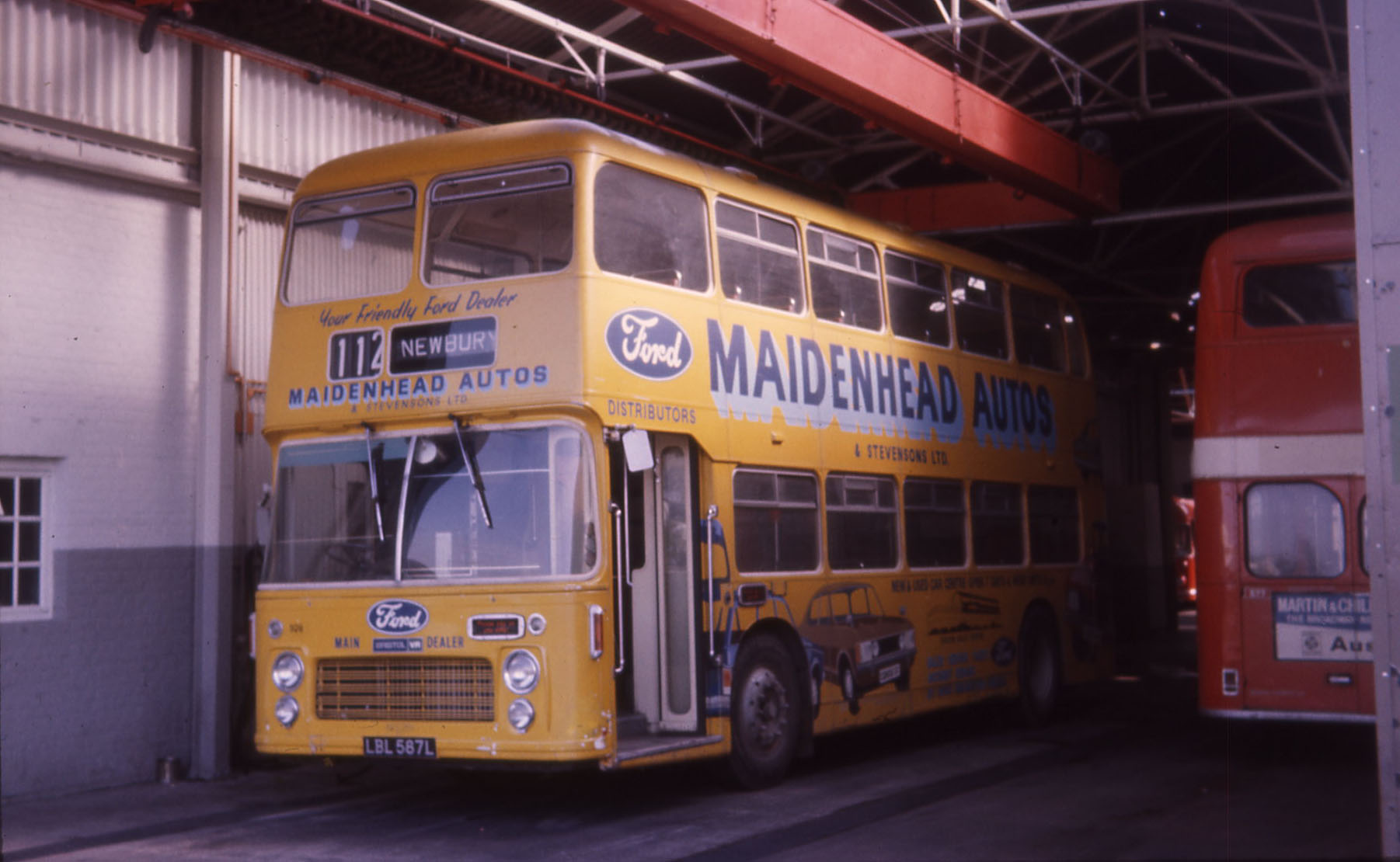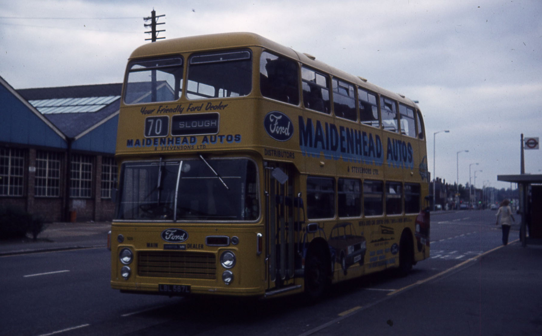 VR 928 (LBL587L) was one of the trio of Mark 2 VRs delivered new to Alder Valley. They were the first Mark 2 VRs for the company and the first delivered in the new NBC livery. The bus was the one displayed at the forerunner of SHOWBUS, the Brunel University Festival in 1973. It is seen here later in life as an all over advert for Ford dealer Maidenhead Autos.