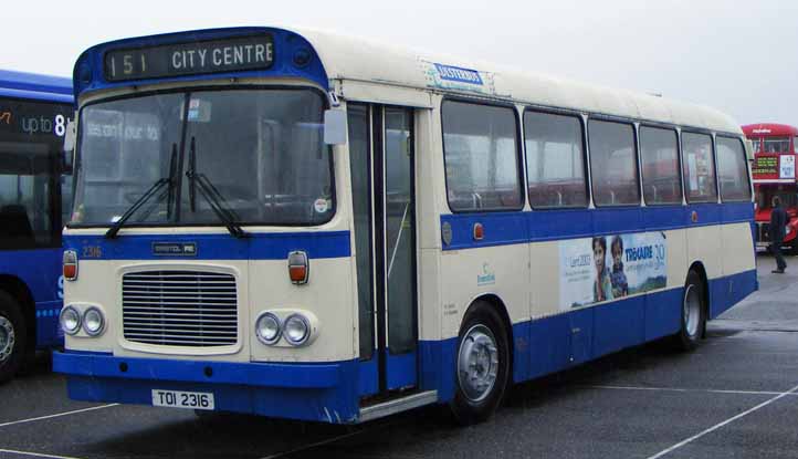 Preserved on the mainland is Ulsterbus Bristol RELL6G 2316 (TOI2316) with distinctive Alexander (Belfast) bodywork. The Ulster twin fleets built up a large contingent of REs and persuaded British Leyland to continue supplying them as an "export" chassis for some years after RE sales in the UK had been cut off in favour of the Leyland National. The bus is seen at the 2007 North Weald event. |