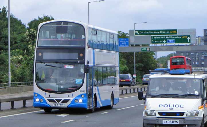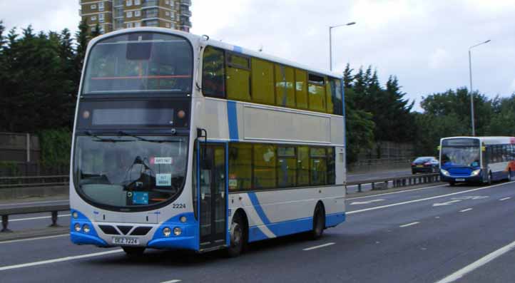 Volvo 2224 (OEZ7224) is slightly older than the others, a 2007 delivery. It is seen heading south on the A12, probably heading to the London Exhibition Centre, followed by a Stagecoach Enviro300. |