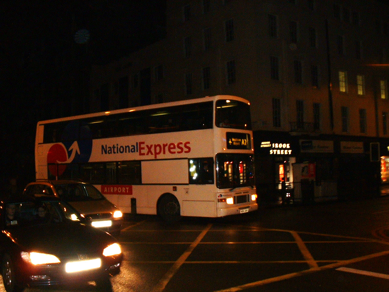 London United sold the Airbus operation to National Express, which consolidated it with its other airport operations and painted the Olympians into National Express livery. Some of the fleet later transferred to National Express' TWM private hire division. This pair were posed together at SHOWBUS international 2003 with A129 (N129YRW) newly in National Express Airport livery. |