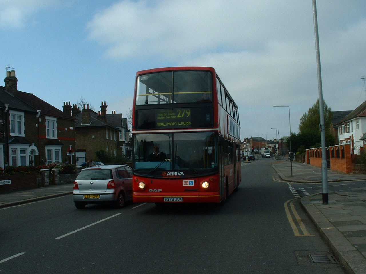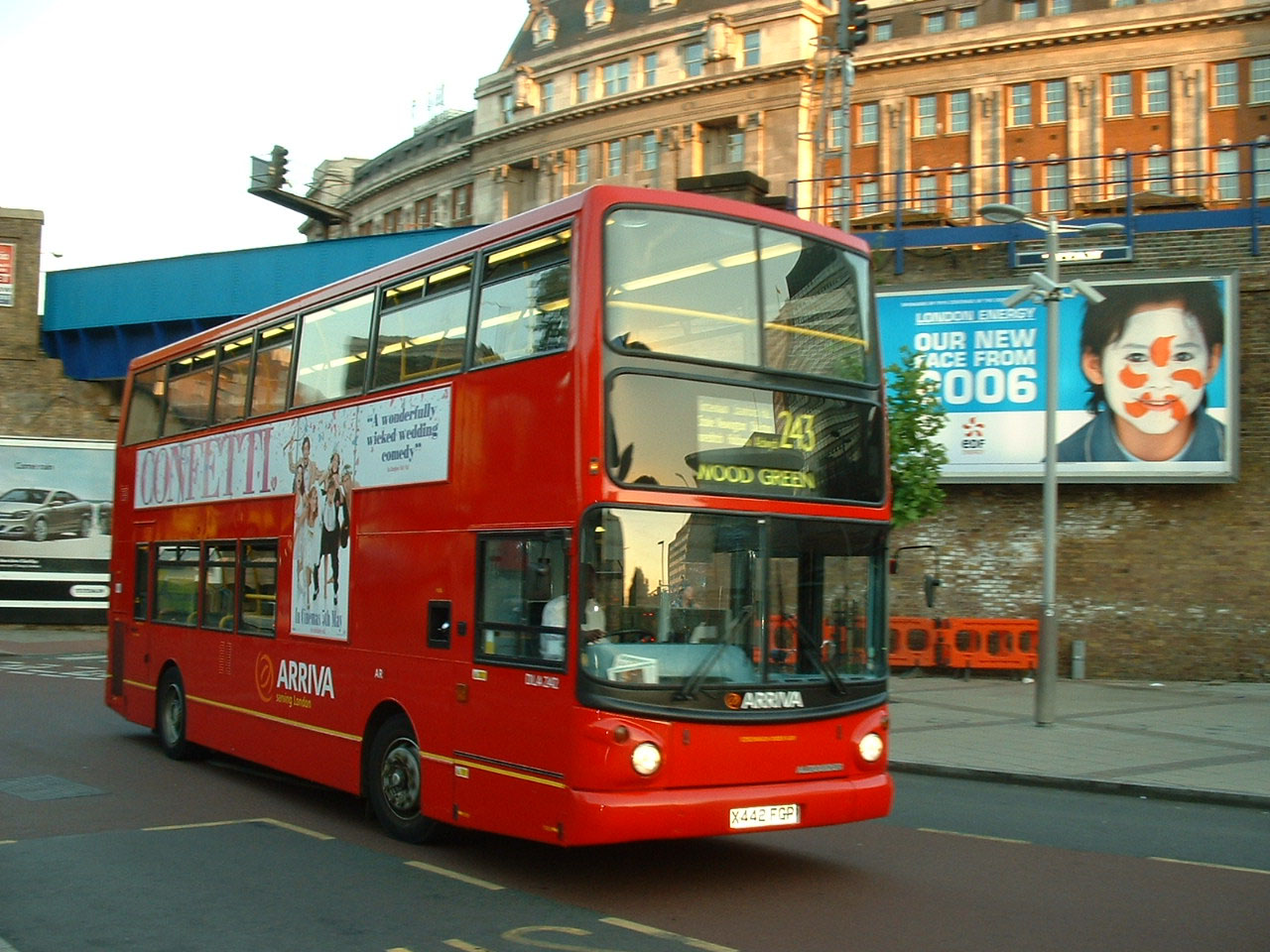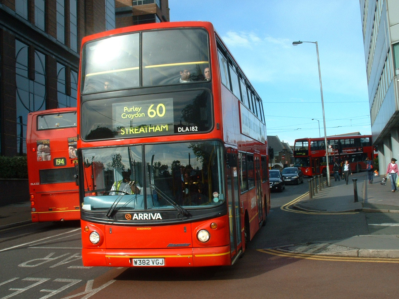 By June 2007 sister vehicle DLA182 (W382VGJ) had lost its "cow horns" to Ken Livingstone's dictat of "buses shall be red". It is working for the Southern half of Arriva London in Croydon.