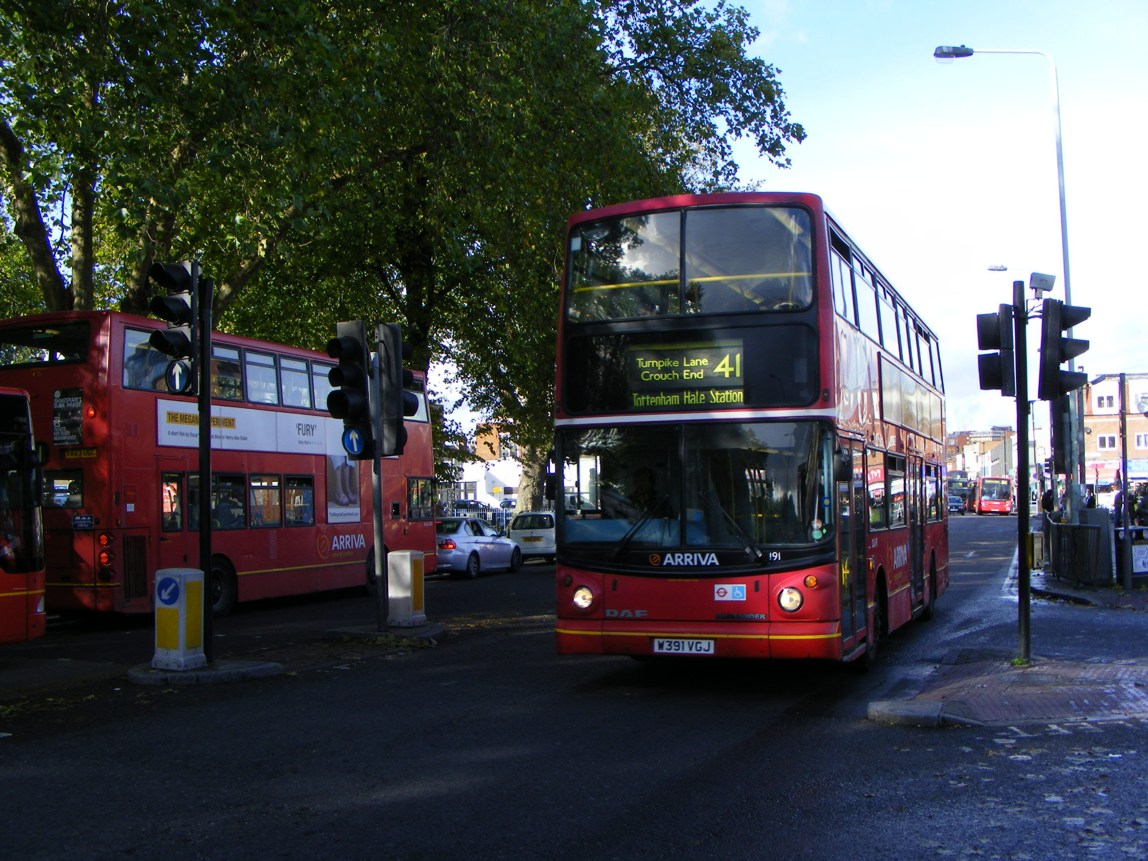 Working the 41 passing Turnpike Lane Station in Haringey in October 2010 is DAF DB250 Alexander ALX400 DLA191 (W391VGJ).