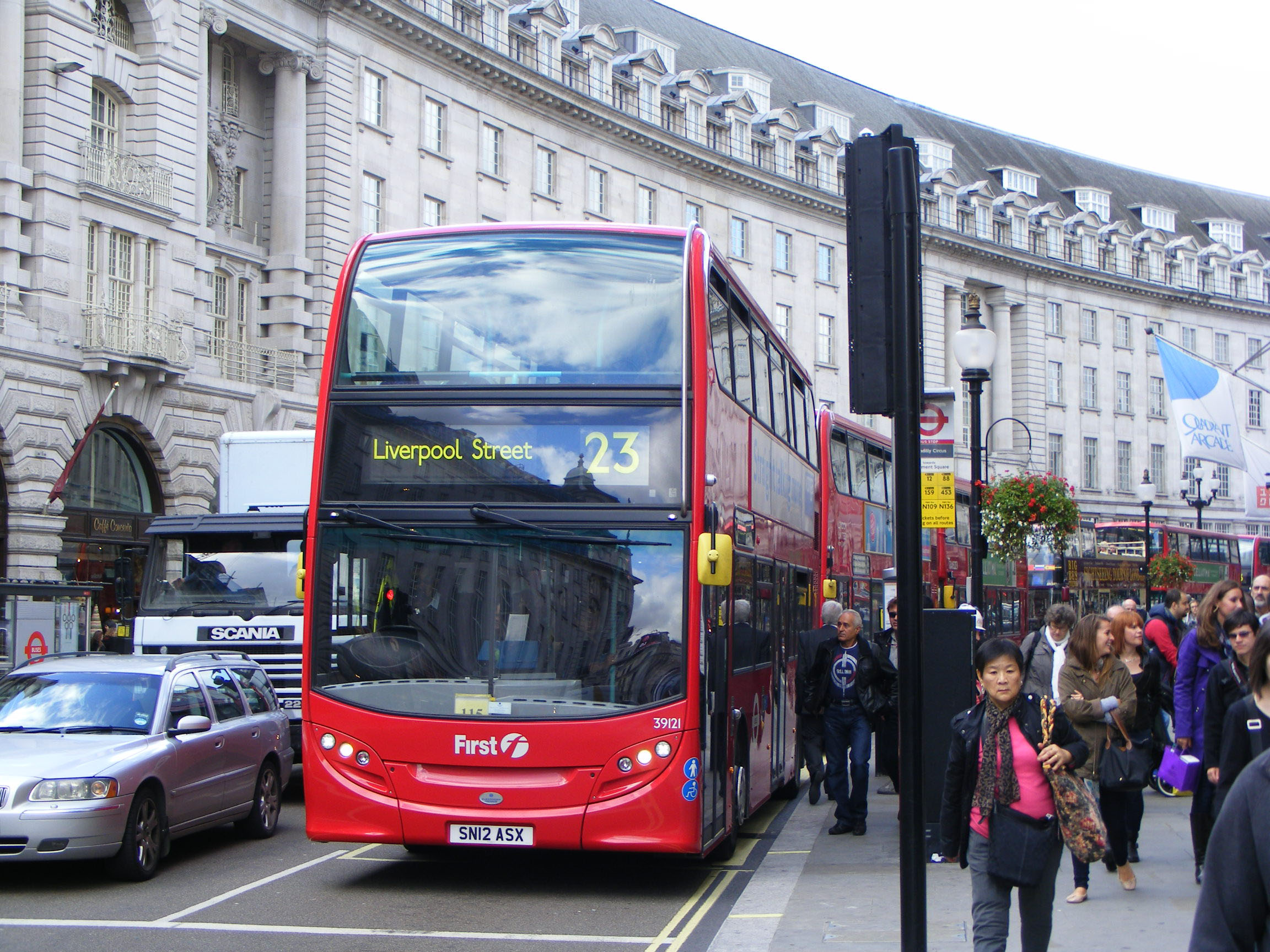 Whilst hybrid DN39114 was lacking the H in its fleet number prefix, 39121 (SN12ASX) was missing its DN prefix entirely. It too was seen in Regent Street at the end of September 2012.