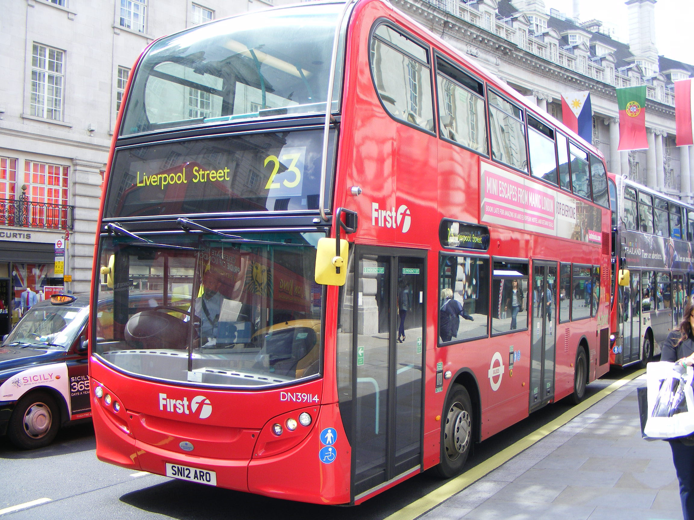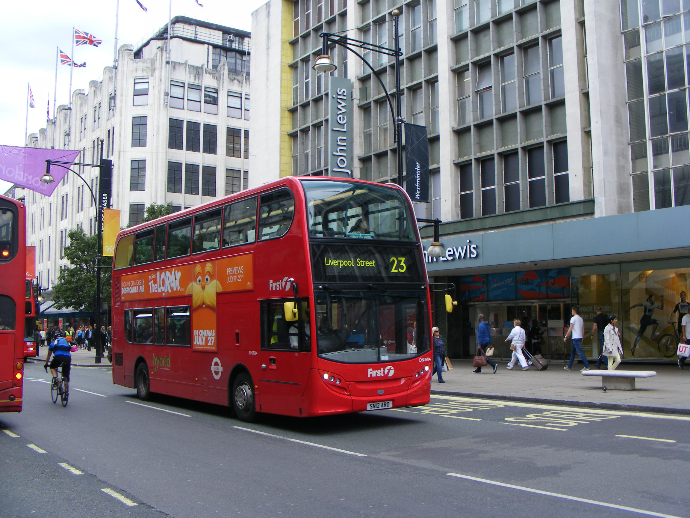 An earlier member of the batch, DN39114 (SN12ARO) lacks the H in its fleet number prefix to denote its hybrid capabilities. It is seen in Regent Street also in July 2012.