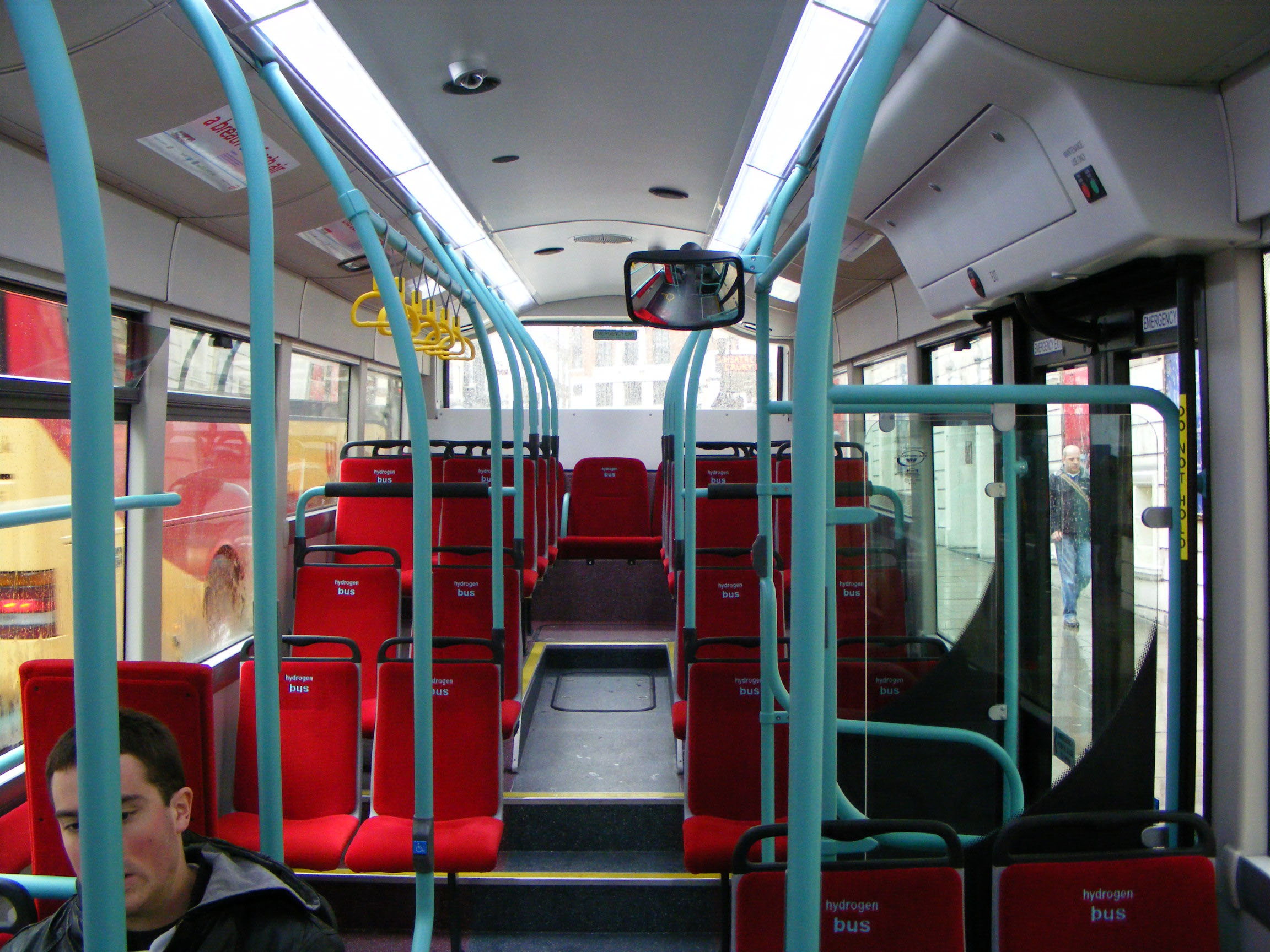 The interior of WSH62993 shows the special "Hydrogen Bus" emblazoned seats, but nothing yet inside the bus to inform the passengers as to what exactly a hydrogen bus is.