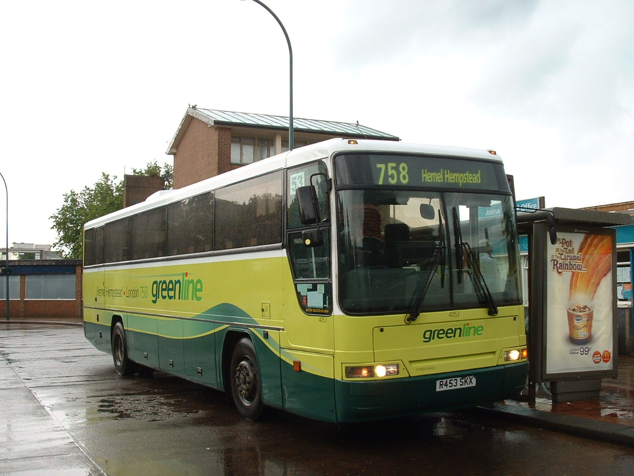 A very wet day in June 2007 saw newly liveried Arriva the Shires DAF SB3000 4053 (R453SKX) terminating service at Hemel Hempstead bus Station. |