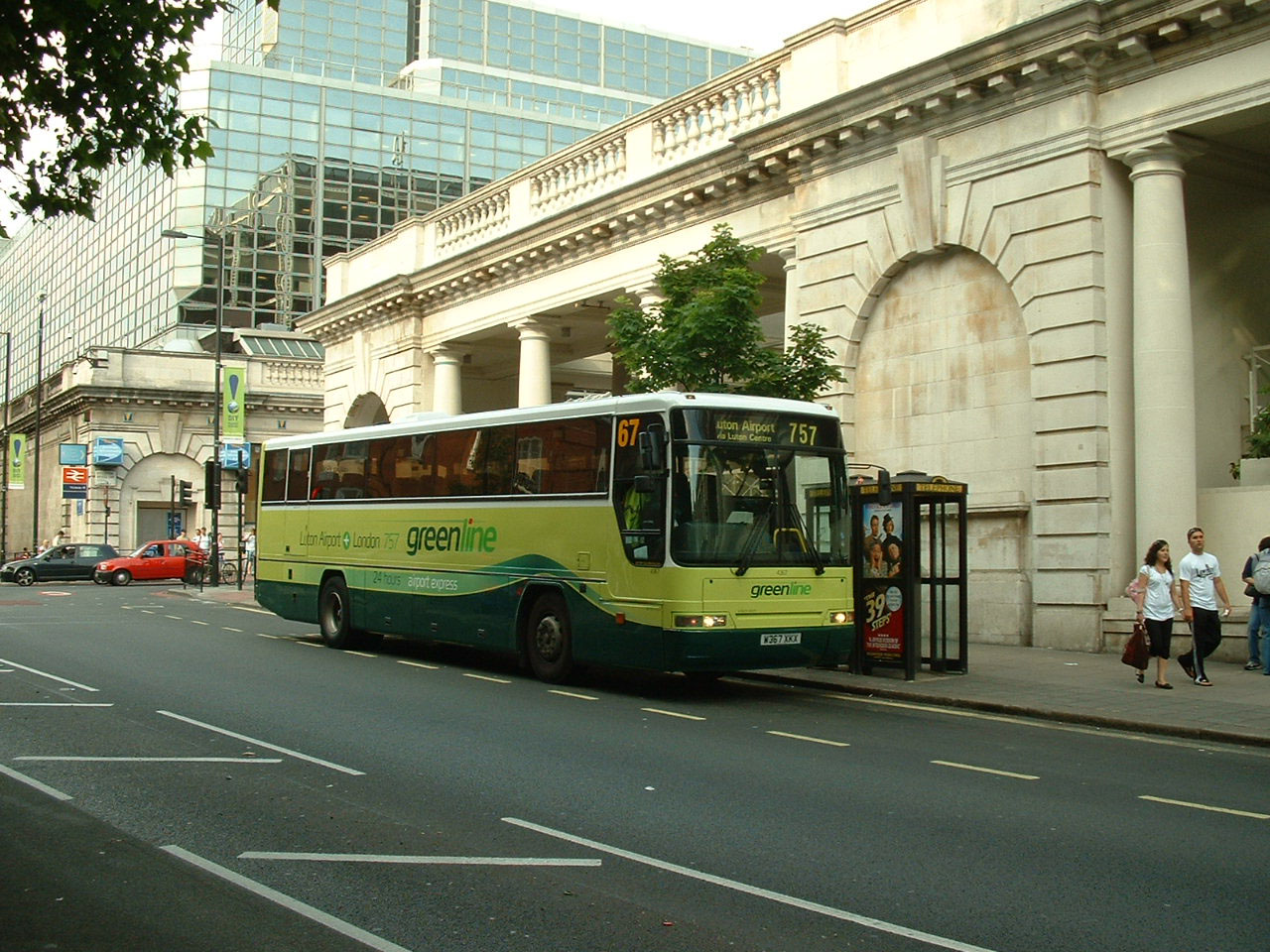 At the end of 2005 a fleet of disabled access Van Hool bodied VDL SB4000 coaches entered service on the 757 between Victoria and Luton Airport. Arriva the Shires 4069 (YJ55WSZ) is seen in Victoria in June 2007, the offside view hides the second door these coaches have at the front for wheelchair access. |