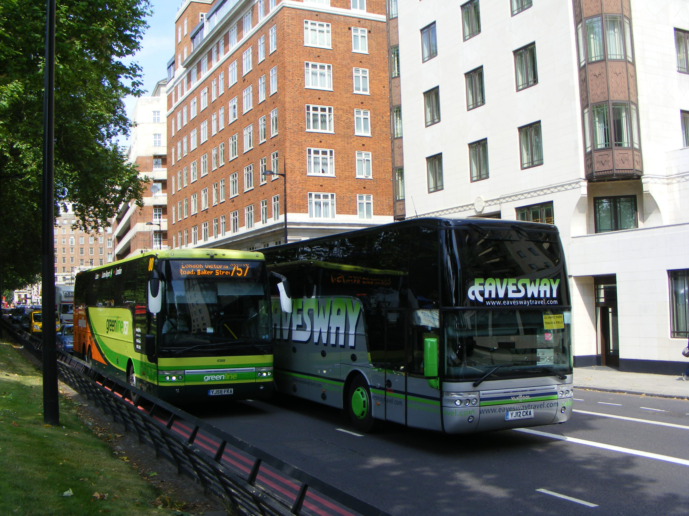 Old meets new. DAF SB4000/Van Hool 4067 (YJ55WSX) passes 4380 (YJ58FKA) in the summer of 2012 in Buckingham Palace Road. Displaced off the 757 by the new Acrons, the DAF/Van Hools worked the 797 Stevenage express. Shortly after the photo was taken 4380 received the half Green Line half easyBus livery and the reliveried coach can be seen in the easyBus gallery. |