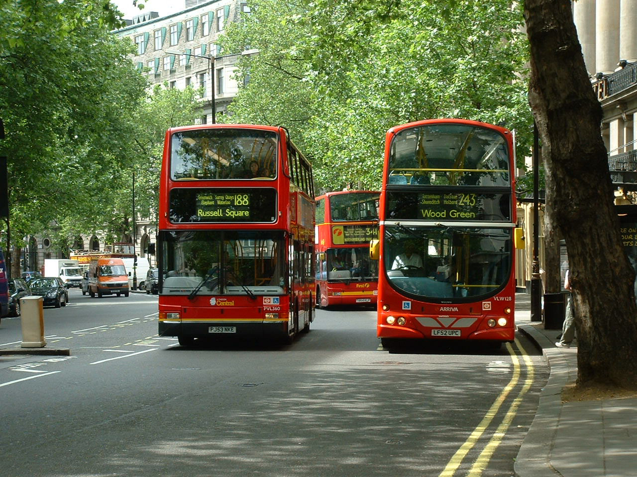 Side by side at the Aldwych are London Central bodied Volvo B7TL PVL360 (PJ53NKE) and Arriva's Wright Eclipse Gemini bodied model VLW128 (LF52UPC) with a First Trident squeezing into the photo behind.