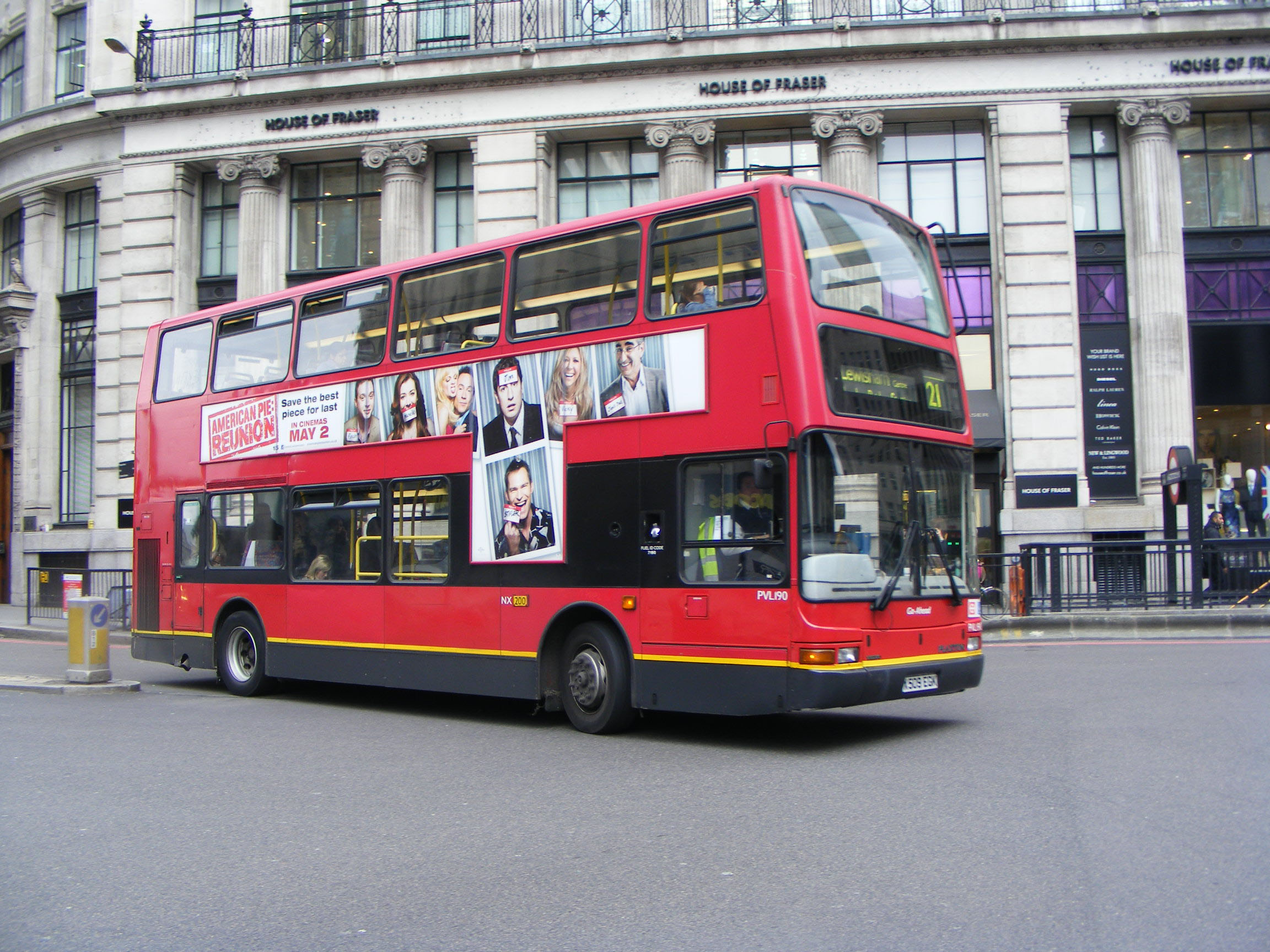 Seen in May 2012 London Central PVL190 (X509EGK) was having a bit of an identity crisis. It appears to have lost its London Central "Clipper" fleetname and acquired a simple Go-Ahead fleetname on the front. Whether this was an inconsequential result of repanneling in the workshop or an experimental gambit prior to the new Go-Ahead London branding is not known. The bus is photographed outside the city branch of the House of Fraser near the Monument.