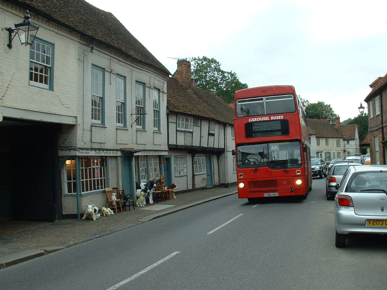 In late October 2007 M1386 (C396BUV) returns to Wycombe after an afternoon school contract. It is passing through the village of West Wycombe with some curious "creatures" watching it from the Furniture repair Shop on the left.