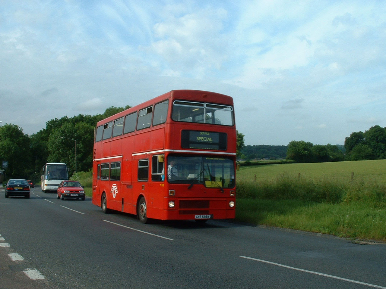 Former M598 (GYE598W) seemingly still in its original coulours is seen in 2006 climbing the hill from Marlow on route to schools in High Wycombe.