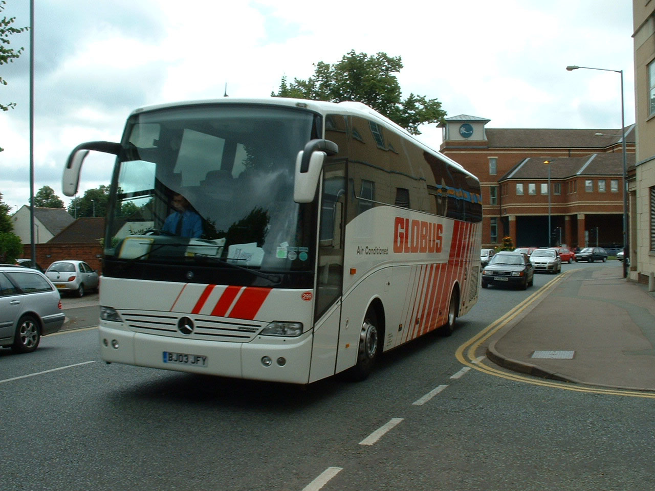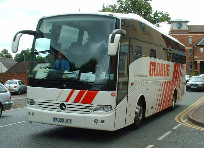 Redwing operate some coaches in Globus Gateway livery under contract. This Mercedes 1856RL, BK03JFY, is seen arriving in Stratford on Avon in July 2004.