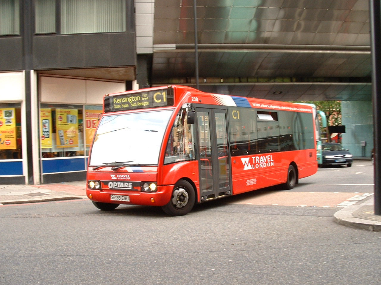 Solo 238 (S238EWU) and the other Solos on the C1 returned to National Express' Travel London ownership after a spell with Limebourne. Seen in June 2004, 238 is in a slightly revised colour scheme. |